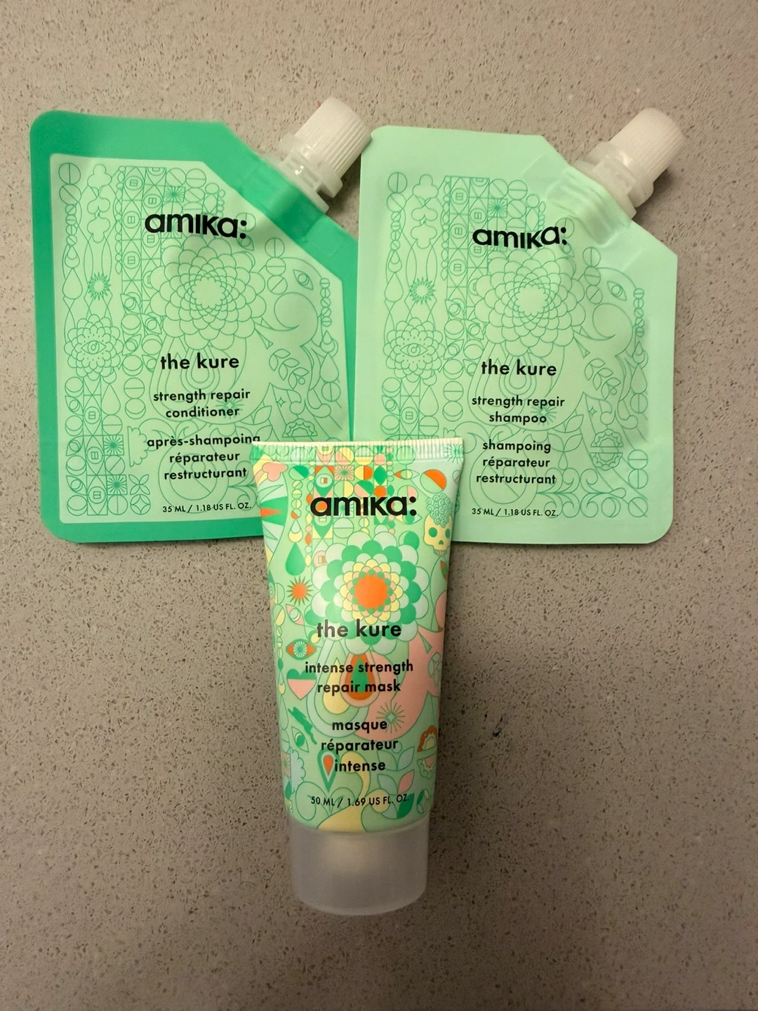 Three travel-sized Amika The Kure products: strength repair shampoo, strength repair conditioner, and intense strength repair mask. Shampoo and conditioner are 35ml each. The mask is 50ml.