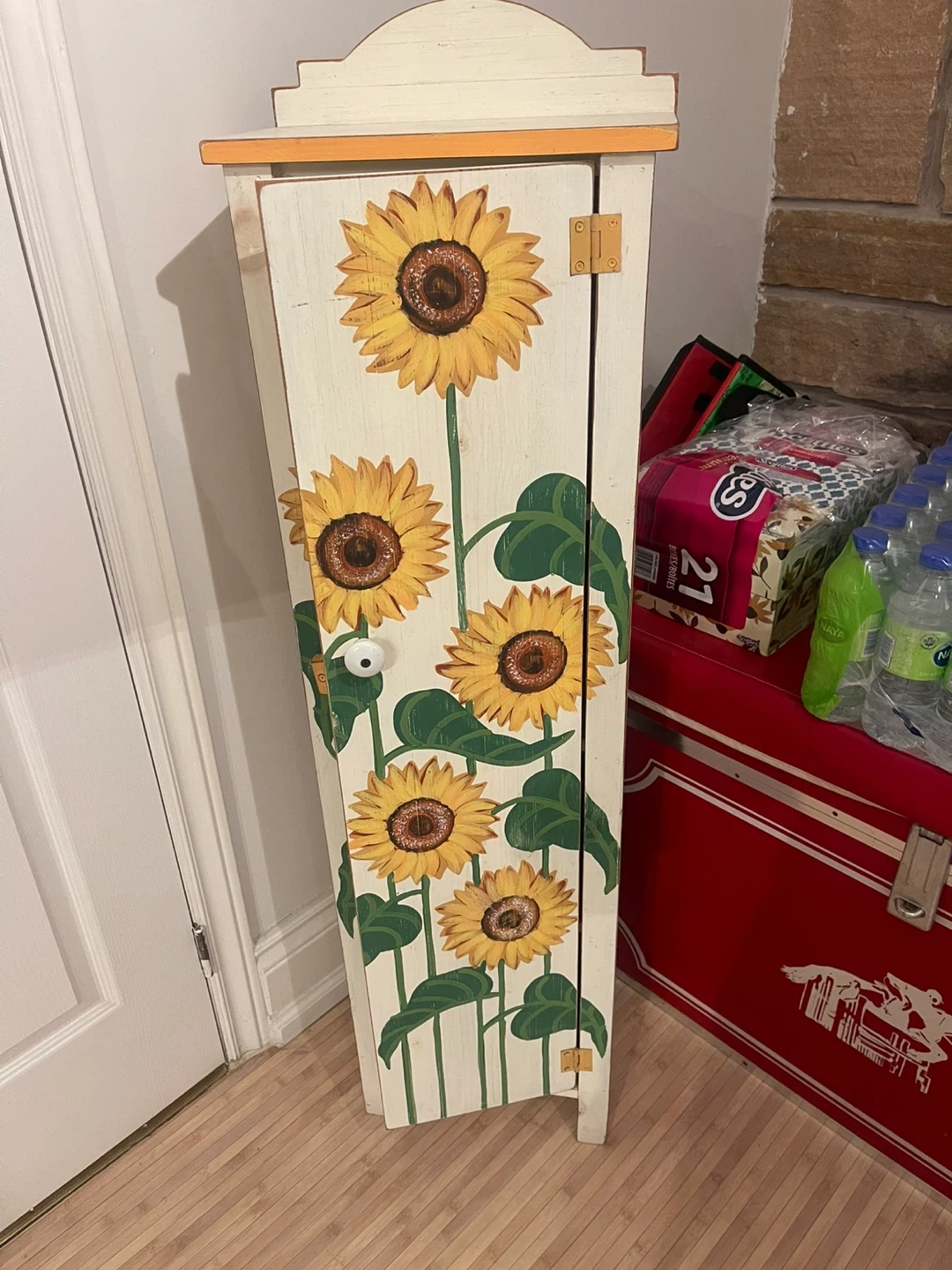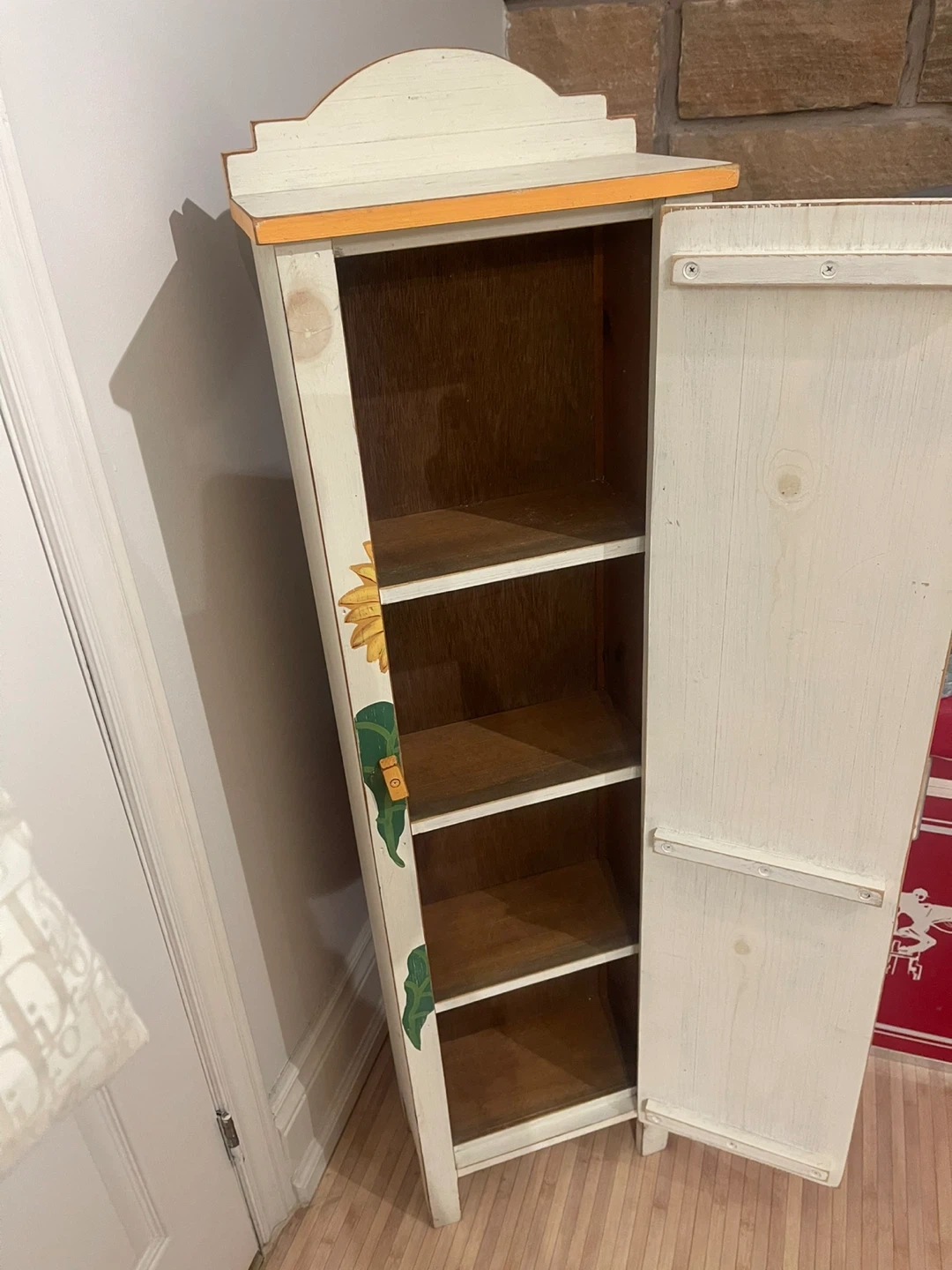 Check out this unique wooden cabinet! It features a lovely sunflower design painted on the front. It has four shelves inside, perfect for storage. The cabinet is in great condition and ready to add some charm to your home
