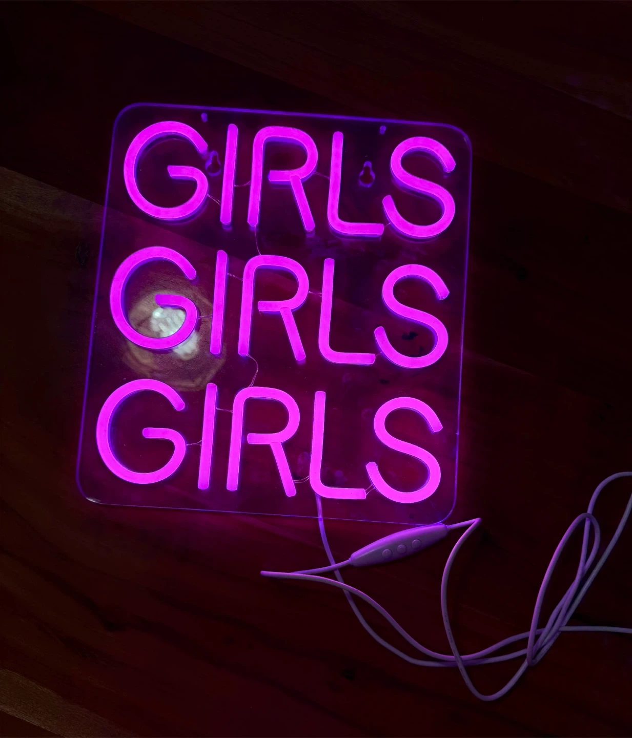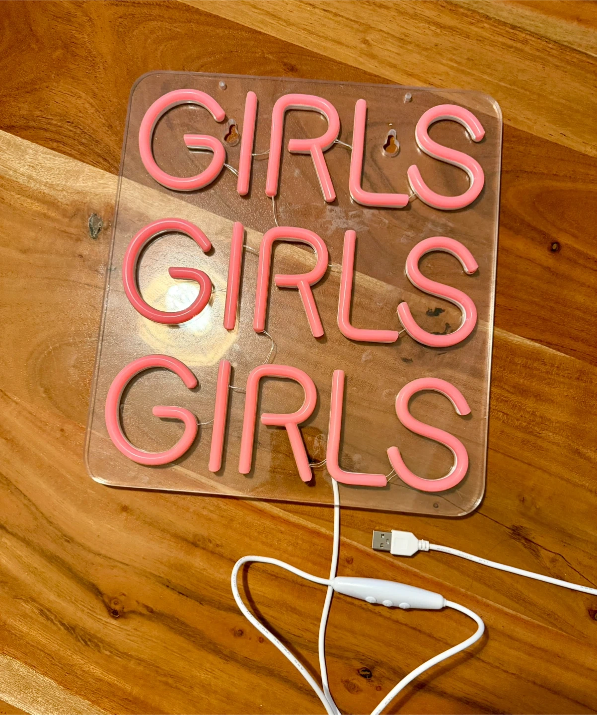 This neon-style LED sign spells out 'GIRLS GIRLS GIRLS'. It's mounted on a clear acrylic backing. The sign is powered by a USB cable and includes an inline on/off switch with brightness controls. Perfect for a bedroom, dorm, or a fun party decoration!