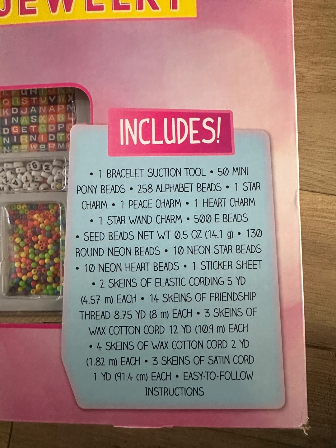 This kit includes everything needed to create personalized bracelets and emoticons. It comes with pony beads, alphabet beads, charms, and various cording and thread. It also includes a bracelet suction tool and a design tool for making bracelets easier! It has been opened but not been used.