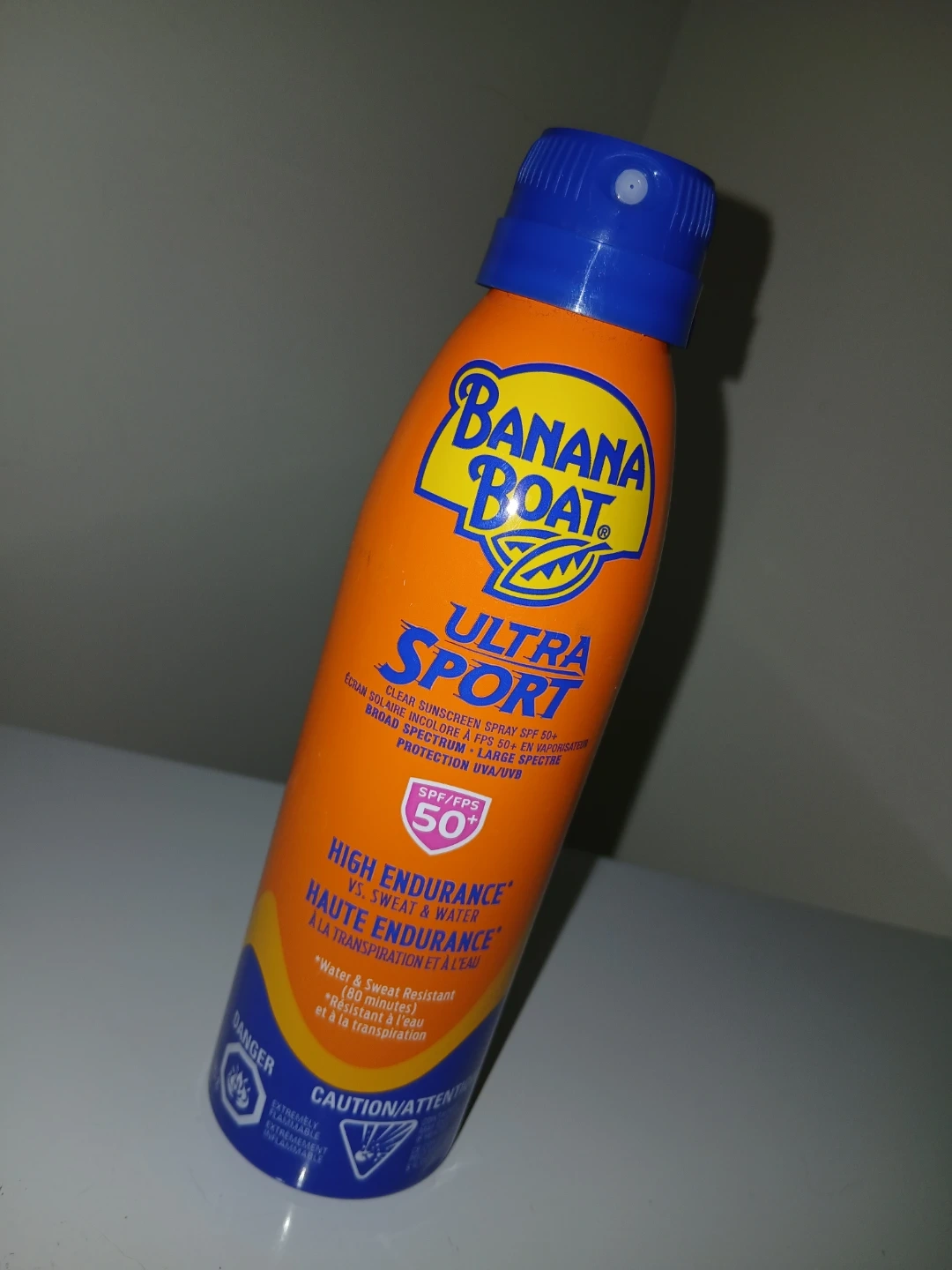 Banana Boat Ultra Sport sunscreen spray with SPF 50+. It's a clear, broad-spectrum spray that's water and sweat resistant for 80 minutes.