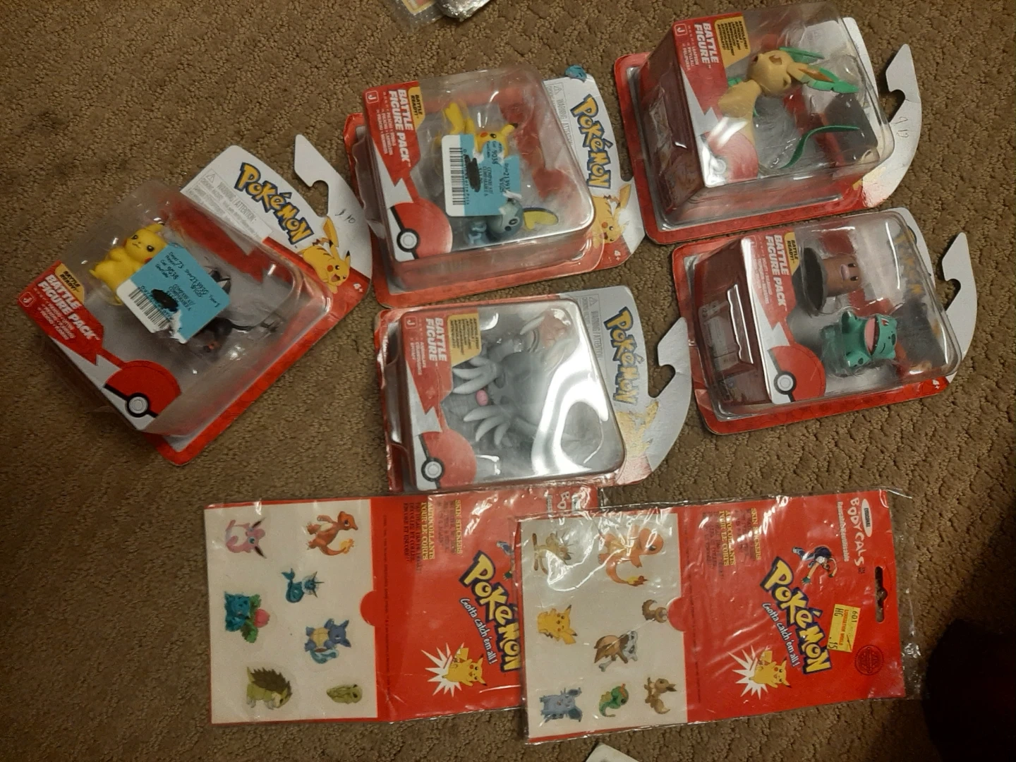 Collection of assorted Pokemon Battle Figure Packs. Includes sticker sheets featuring various Pokemon characters. These are great for any Pokemon fan!