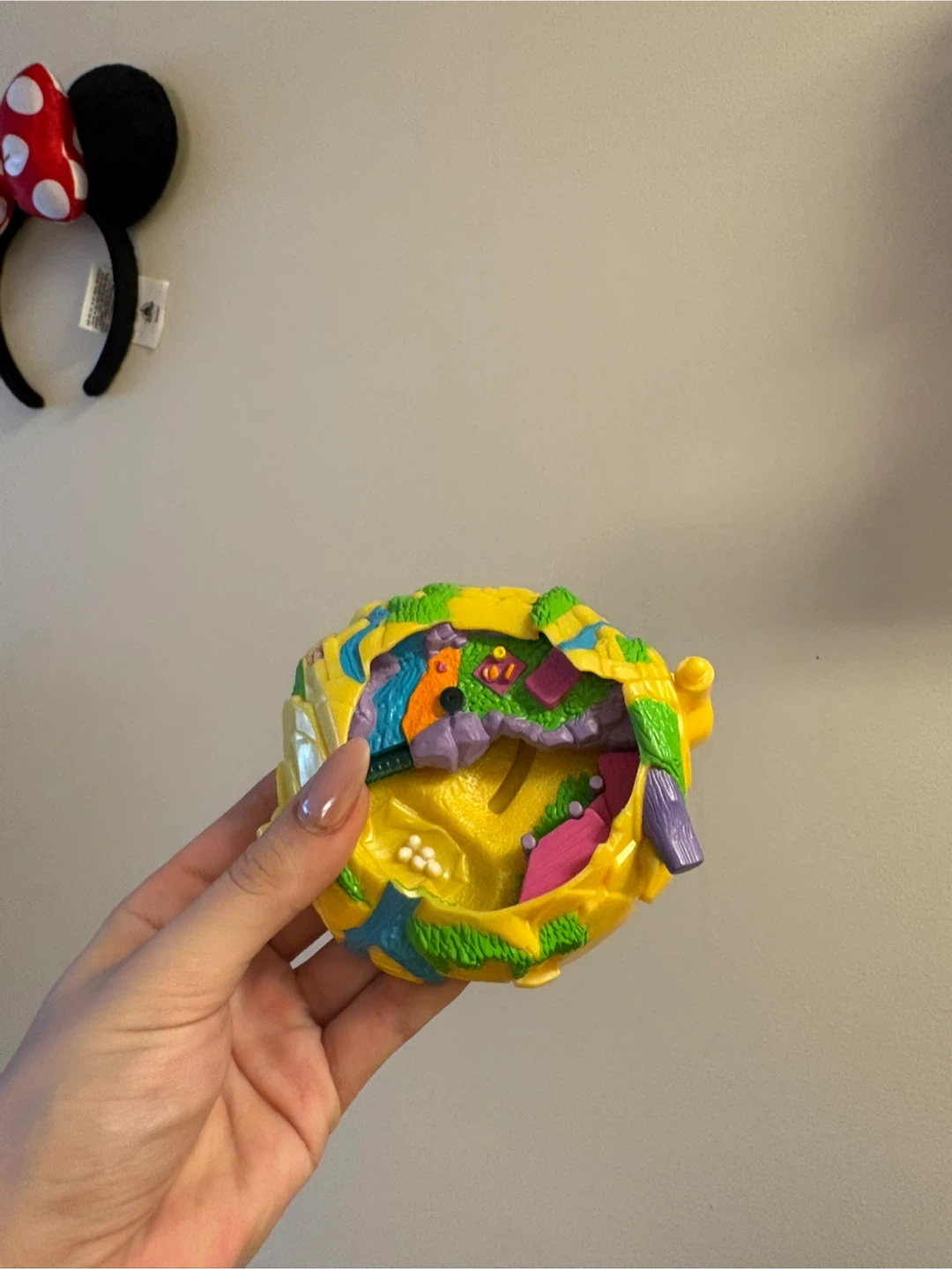 This is a colourful Polly Pocket World play set. It's shaped like a sphere and opens up to reveal different play areas with miniature details. It's great for imaginative play on the go!