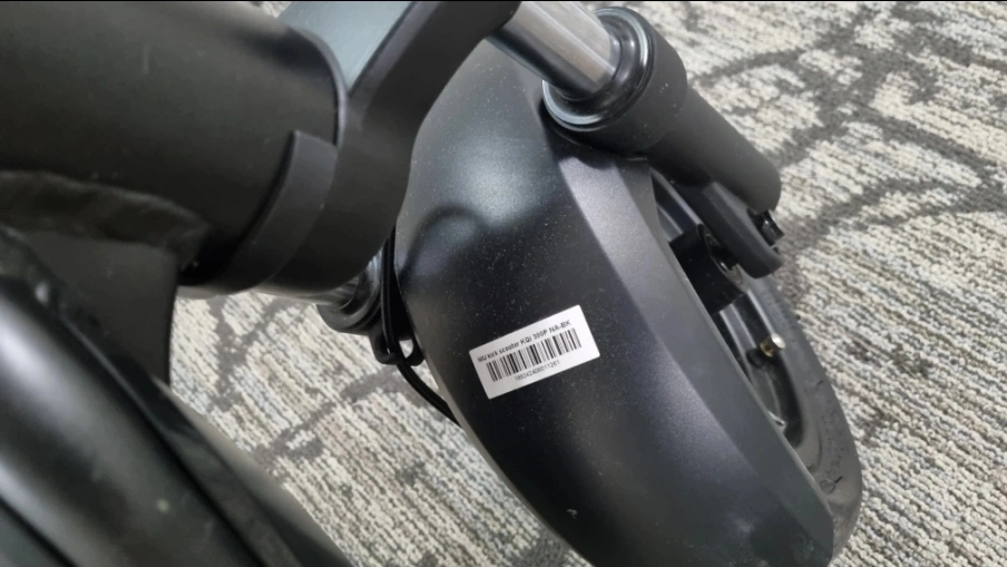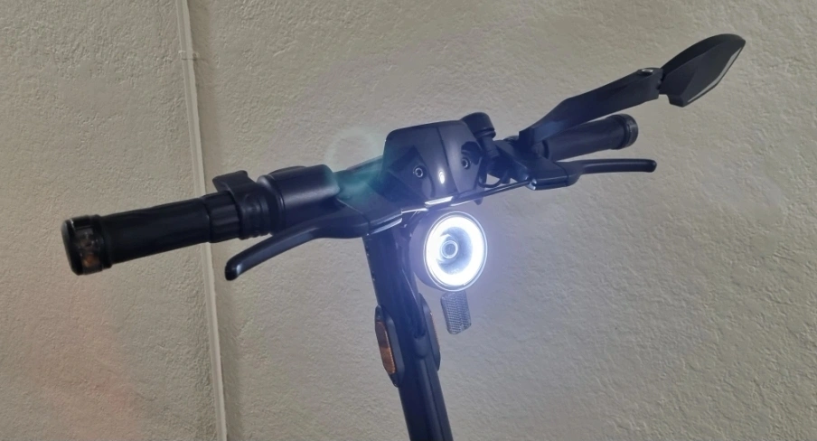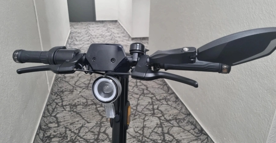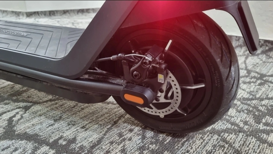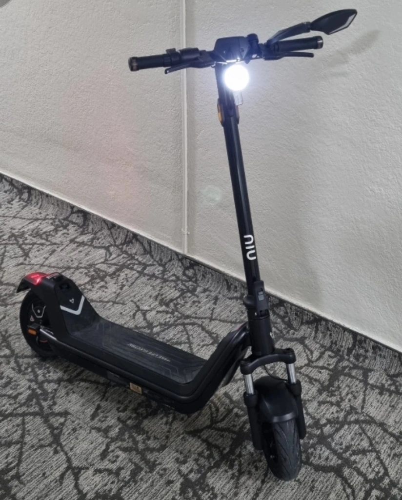Electric scooter with front and rear disc brakes. Includes charger, U-lock, and carrying strap.