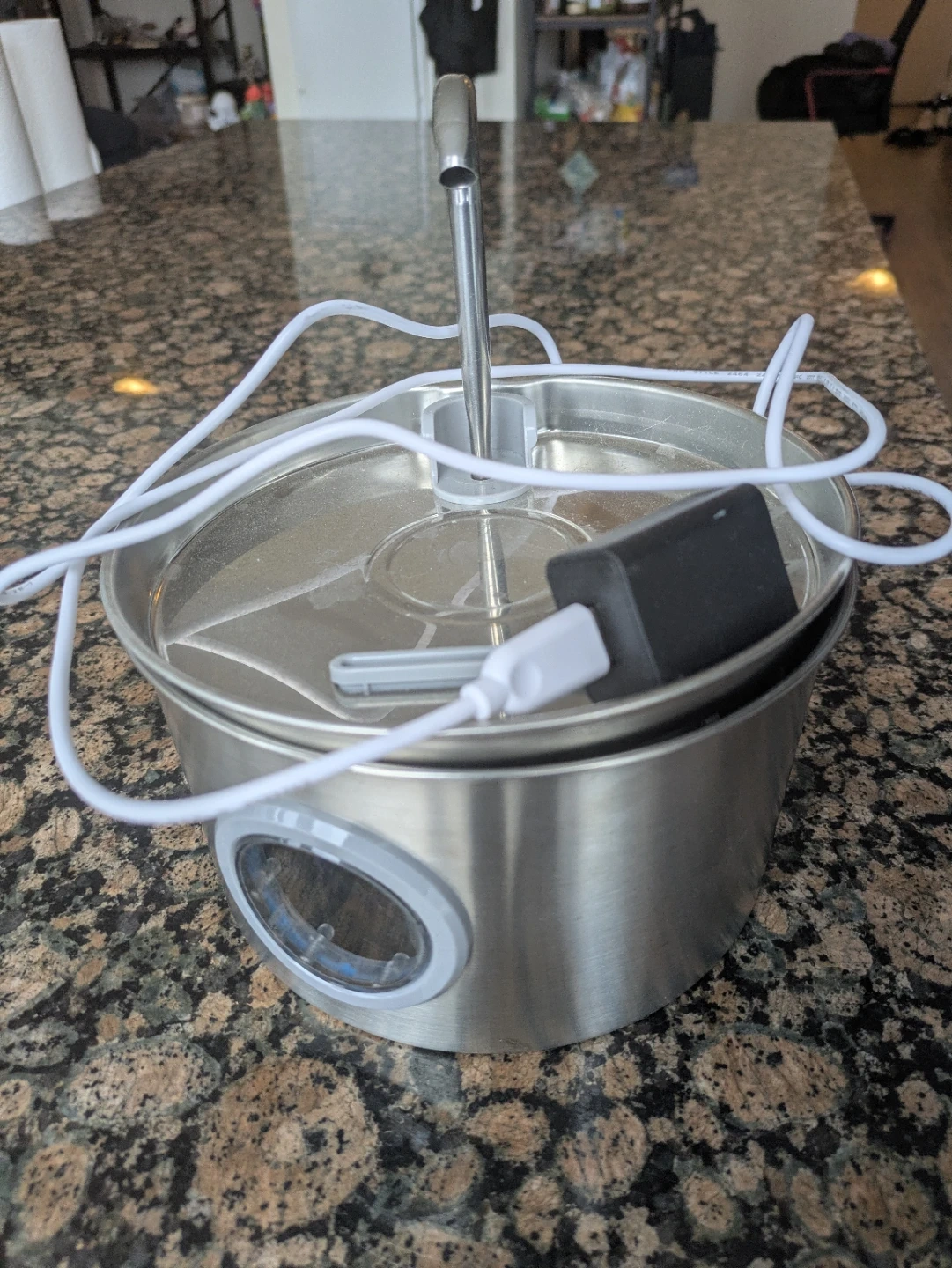Stainless steel pet water fountain. Features a circulating filtration system to keep water fresh. Includes USB power adapter.