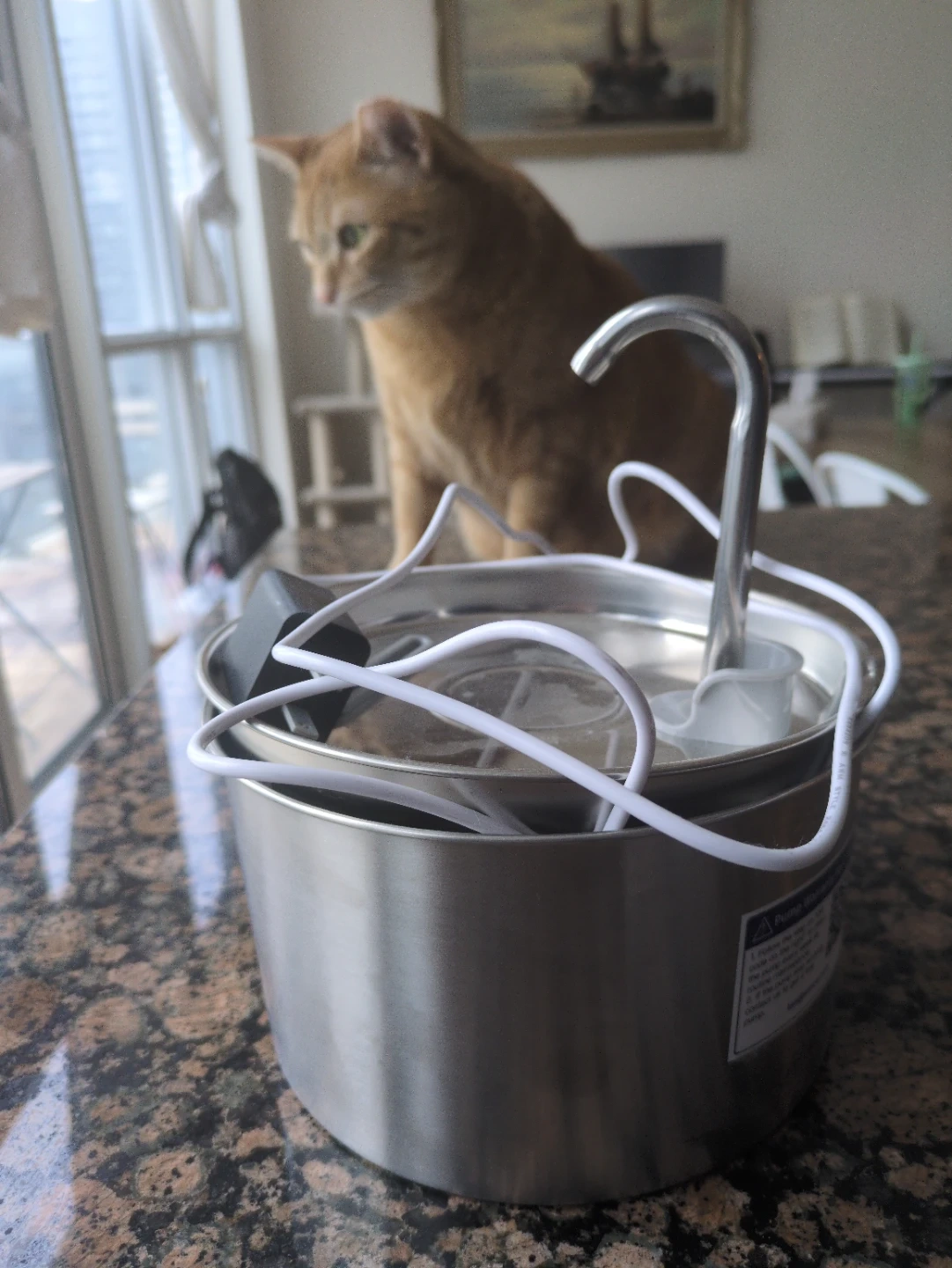 Stainless steel pet water fountain. Features a circulating filtration system to keep water fresh. Includes USB power adapter.