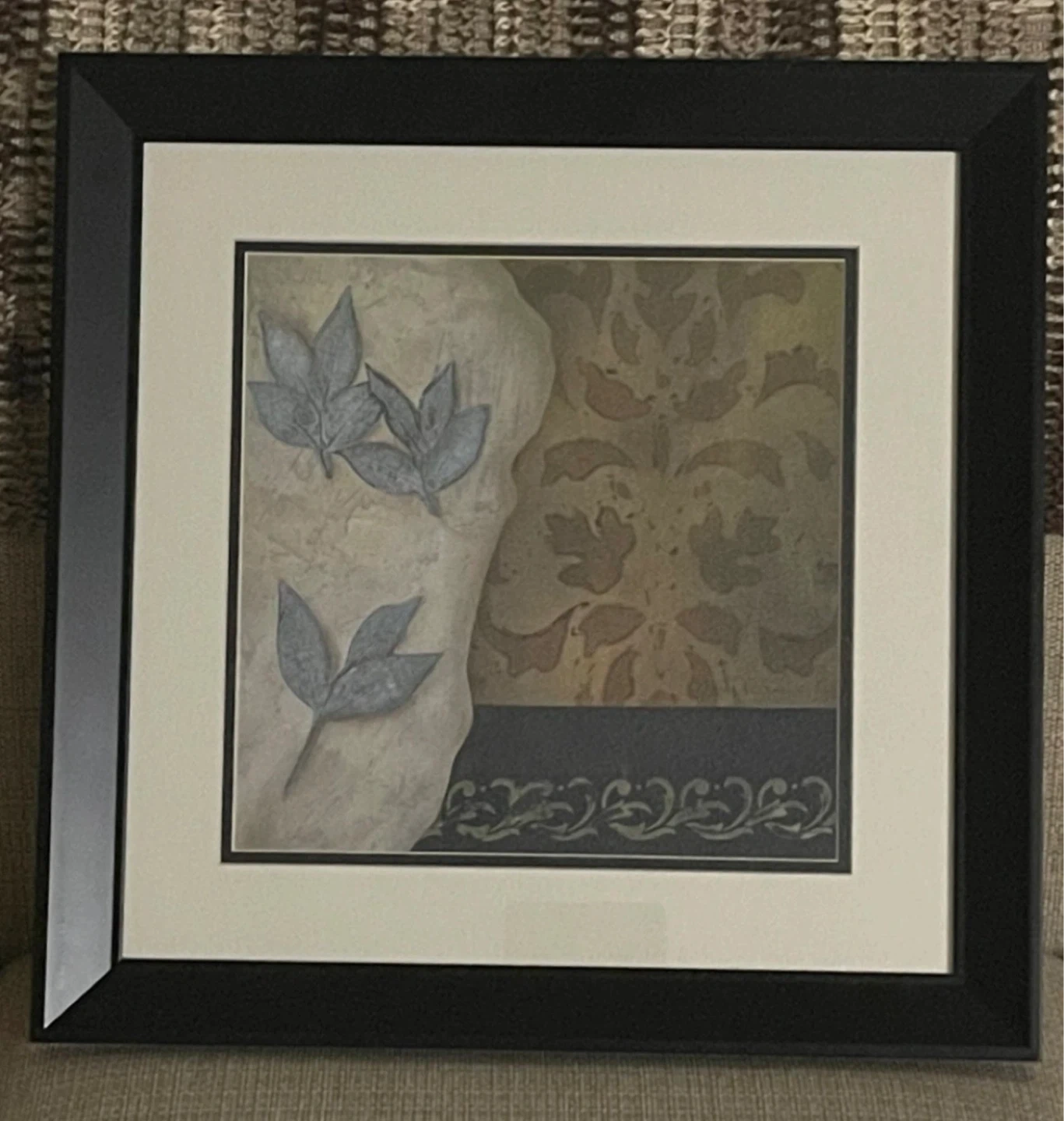 Decorative framed wall art, with real clear glass. Features a textured, neutral-toned background with a subtle abstract leaf pattern. Black frame. Ready to hang. This piece adds a touch of natural-inspired decor to any room. Excellent condition, like new. From smoke-free, pest-free, and pet-free home.
