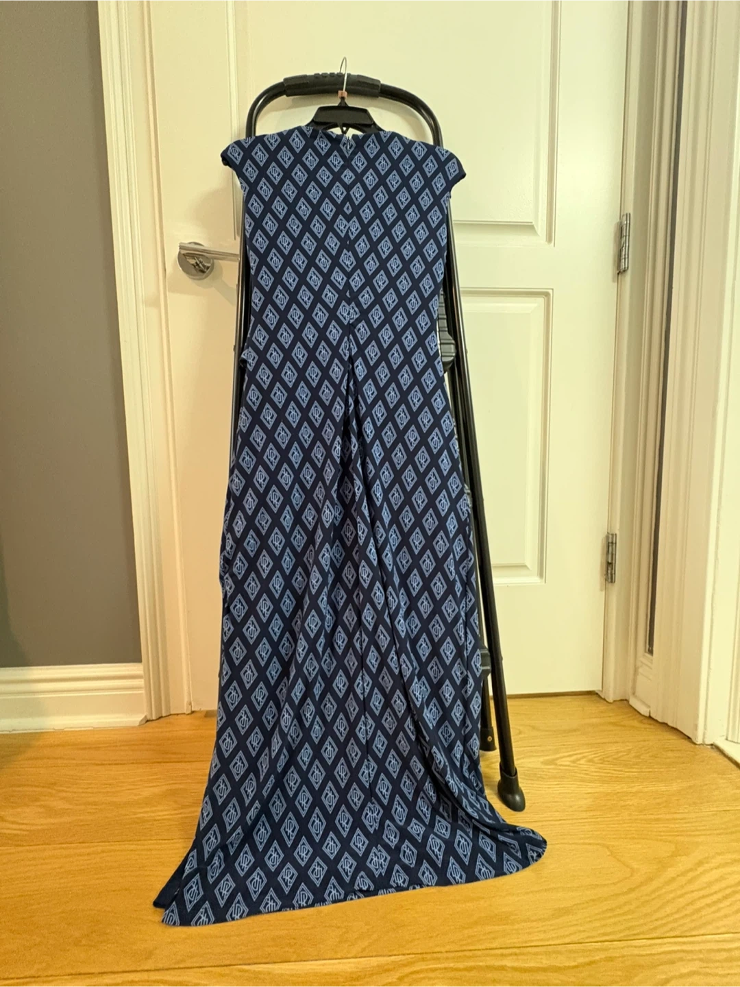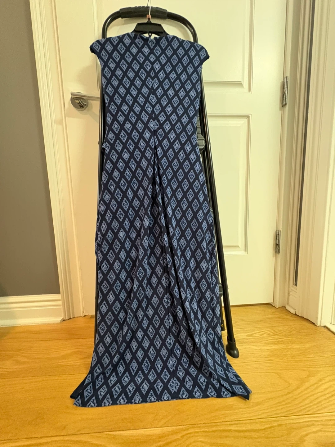 Lauren Ralph Lauren navy maxi dress with a geometric print. It features a flattering wrap-style bodice and a full, flowing skirt. Size 4.