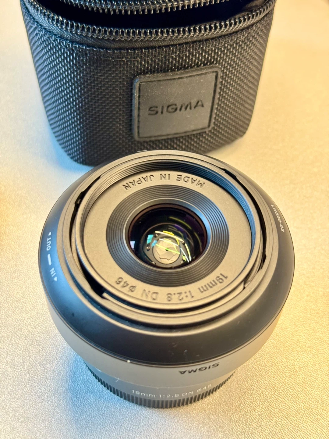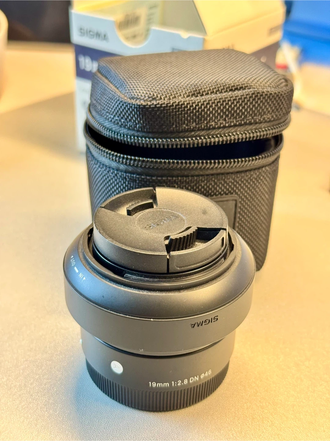 This is a Sigma 19mm F2.8 DN Art interchangeable lens for Sony E-mount. It has a filter size of 46mm. The lens comes with the protective carrying case.