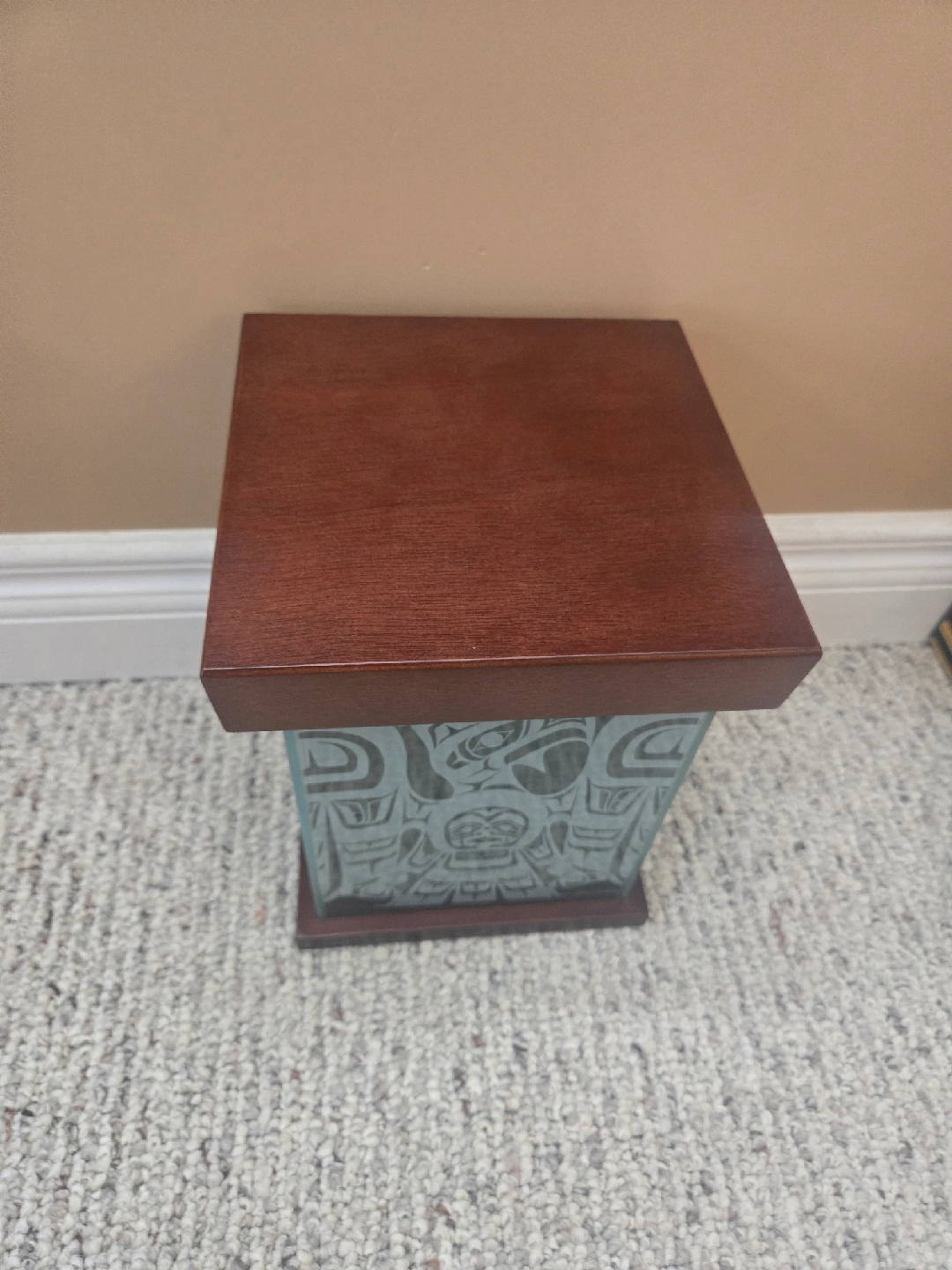 Selling a decorative wooden and glass box. It features a unique design etched into the glass. Perfect for adding a touch of elegance to any room!