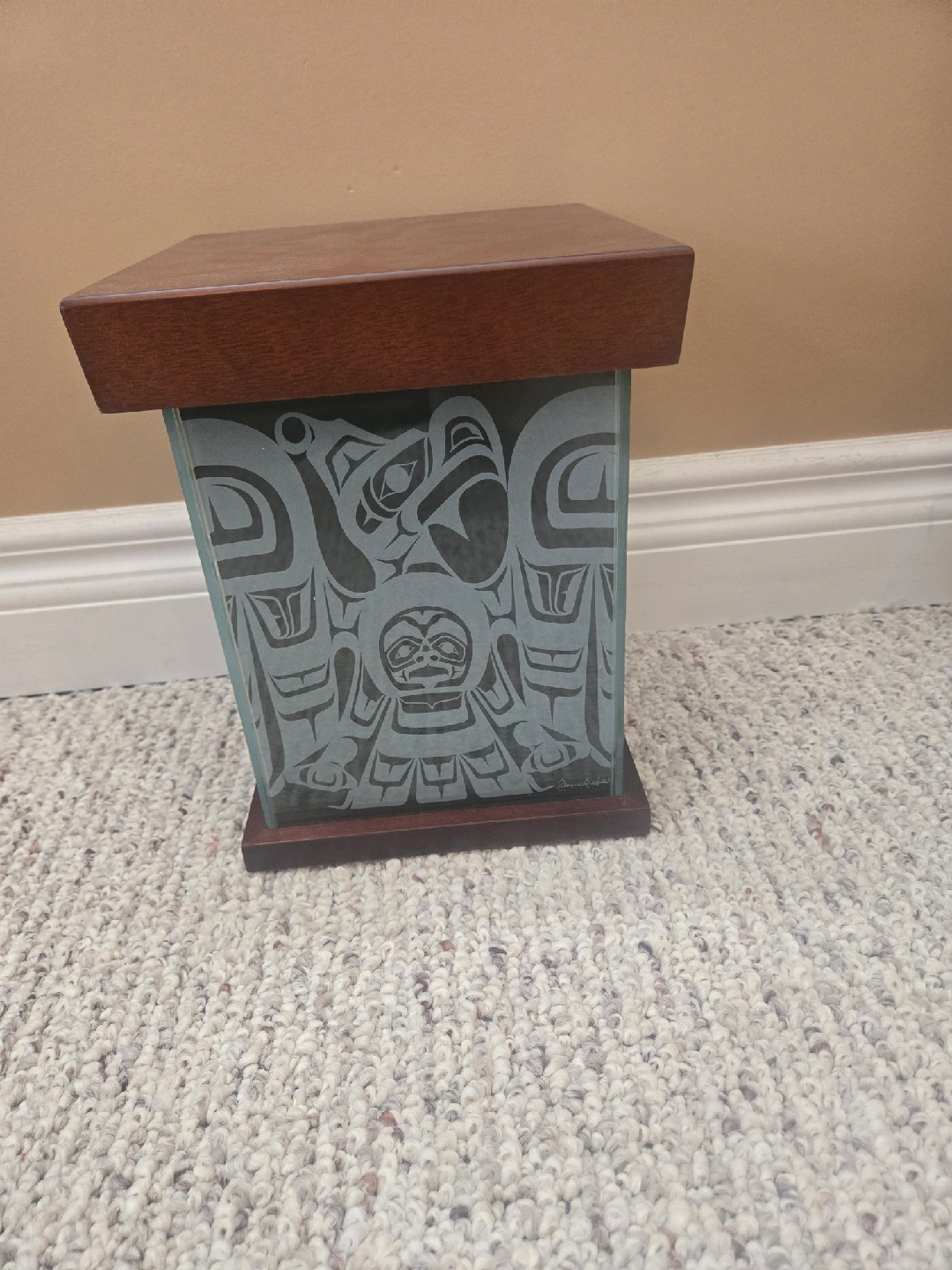Selling a decorative wooden and glass box. It features a unique design etched into the glass. Perfect for adding a touch of elegance to any room!