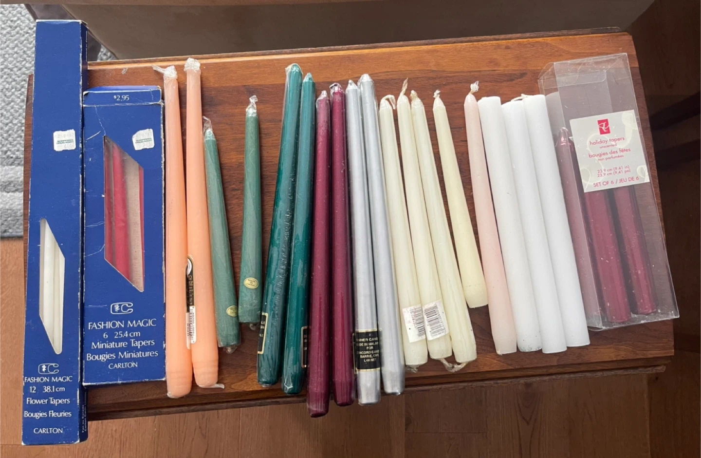 A collection of taper candles, including 12 Flower Tapers at 38.1 cm and 6 Miniature Tapers at 25.4 cm. Carlton tapers, various other colours & a set of 6 unscented holiday taper candles in a box.