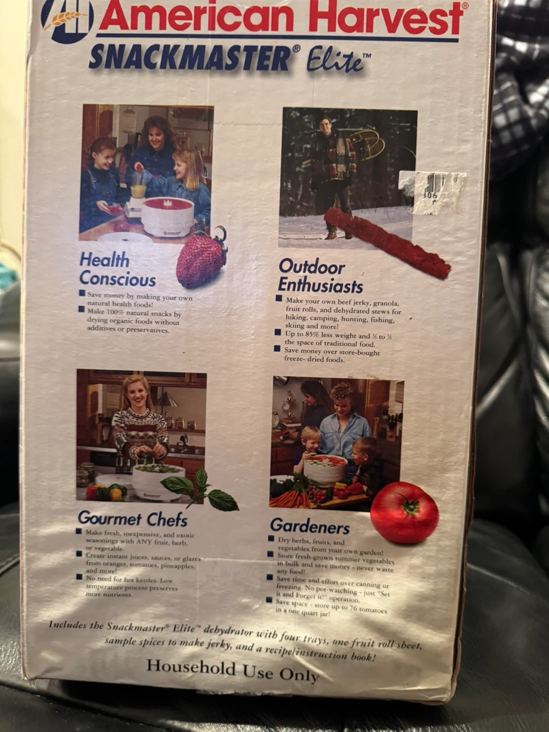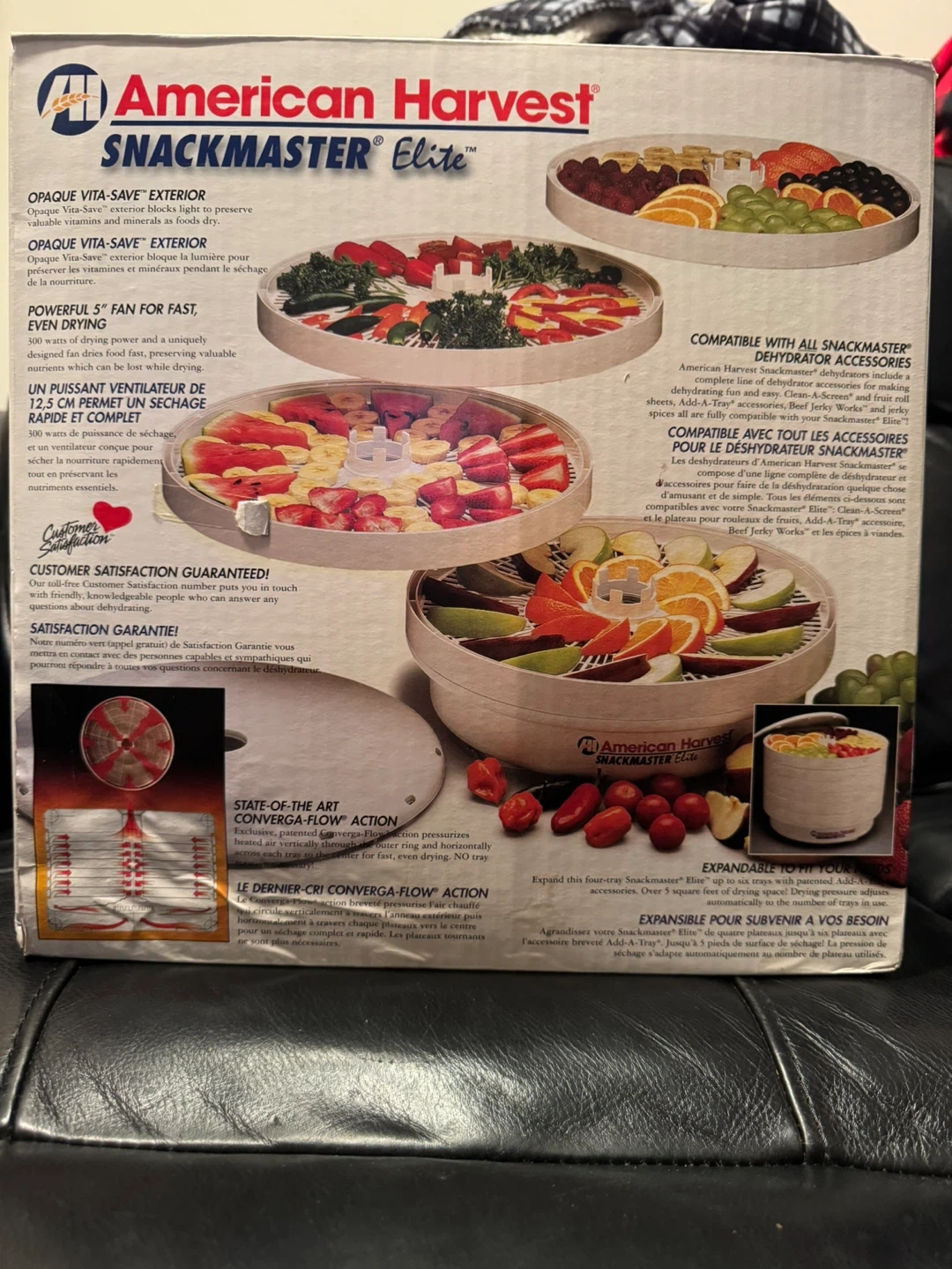 This American Harvest Snackmaster Elite food dehydrator features a 300-watt motor for fast drying. It's expandable to 6 trays with patented Converga-Flow technology for even drying. This dehydrator is great for preserving fruits, vegetables, and jerky. Located in Penticton