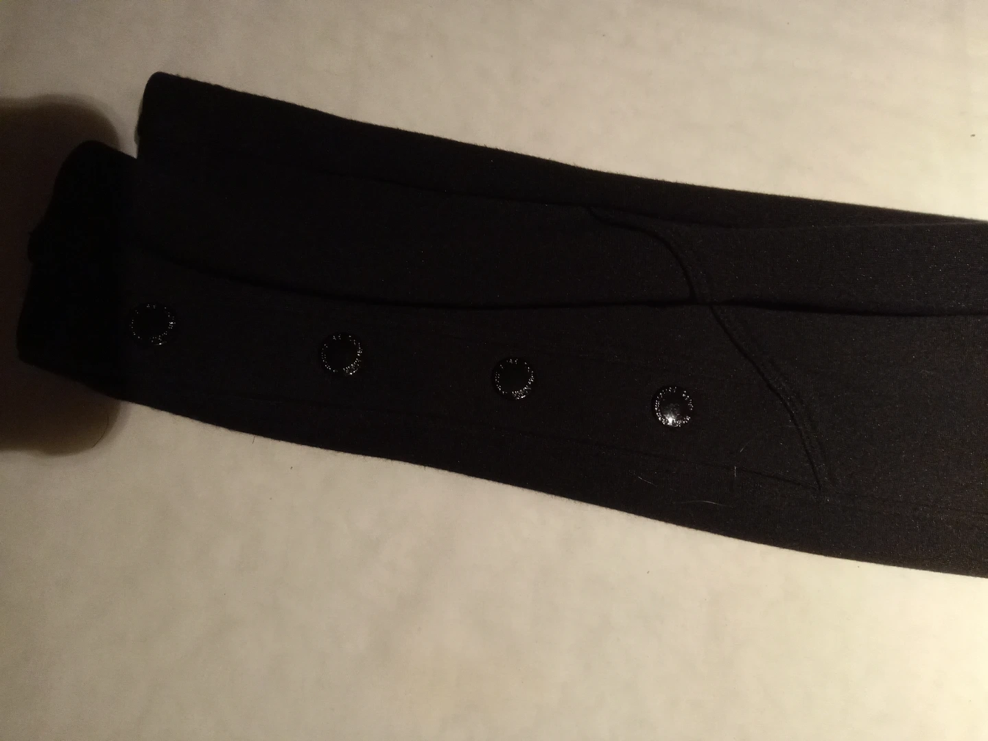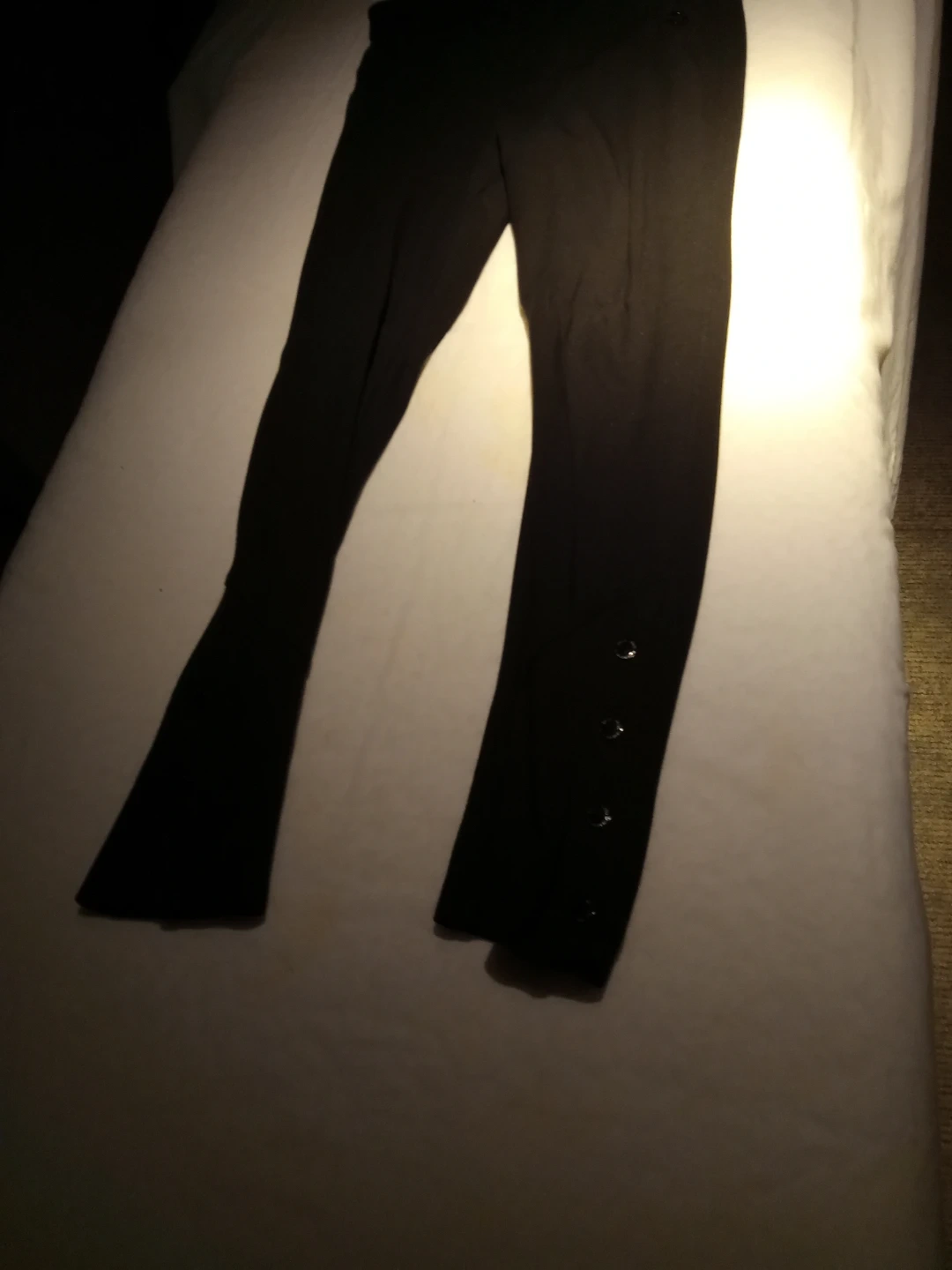 Black pants with a button detail on the hem. The material feels like a blend, offering comfort and style. These pants would be great for a night out or a casual day.