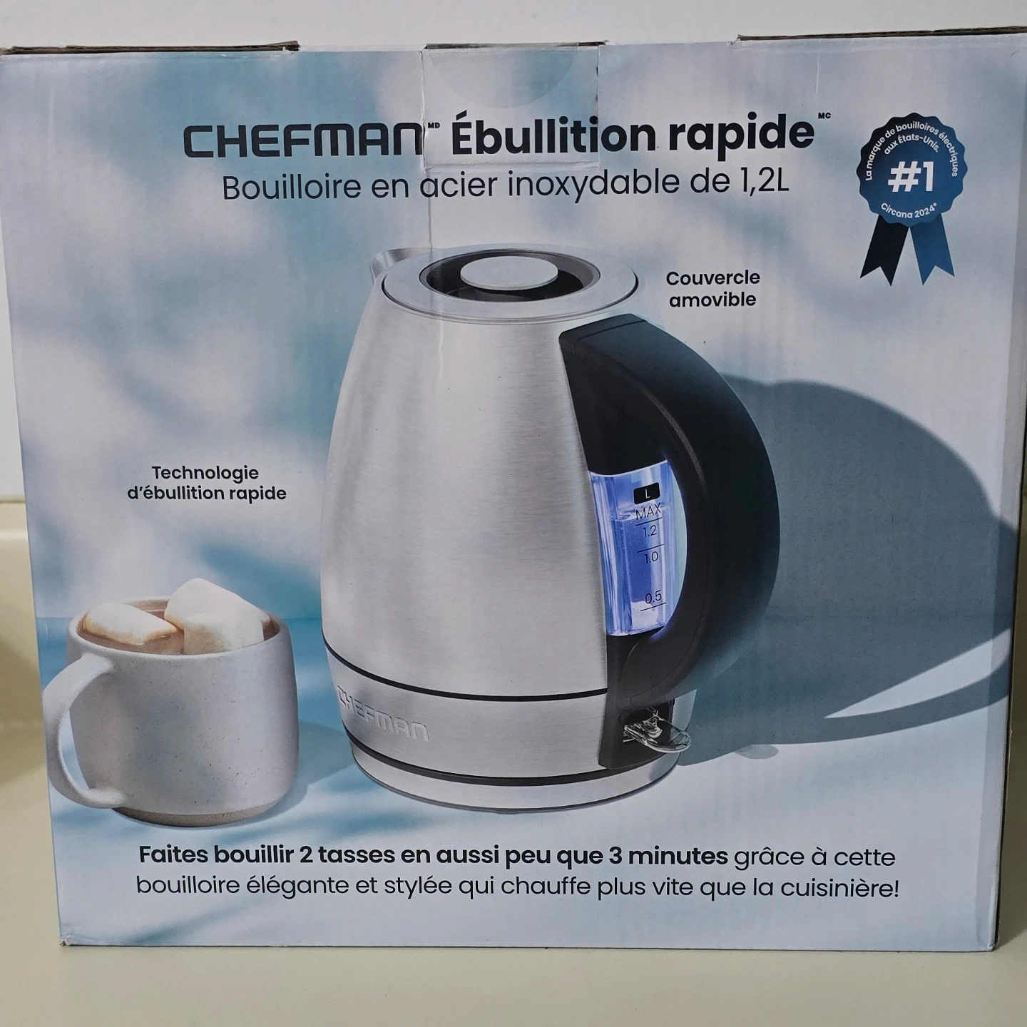 This Chefman electric kettle features rapid boil technology. It's made of stainless steel and has a 1.2L capacity. The lid is removable!
