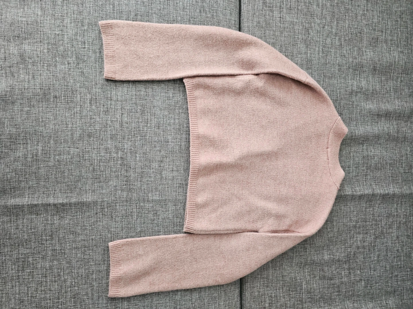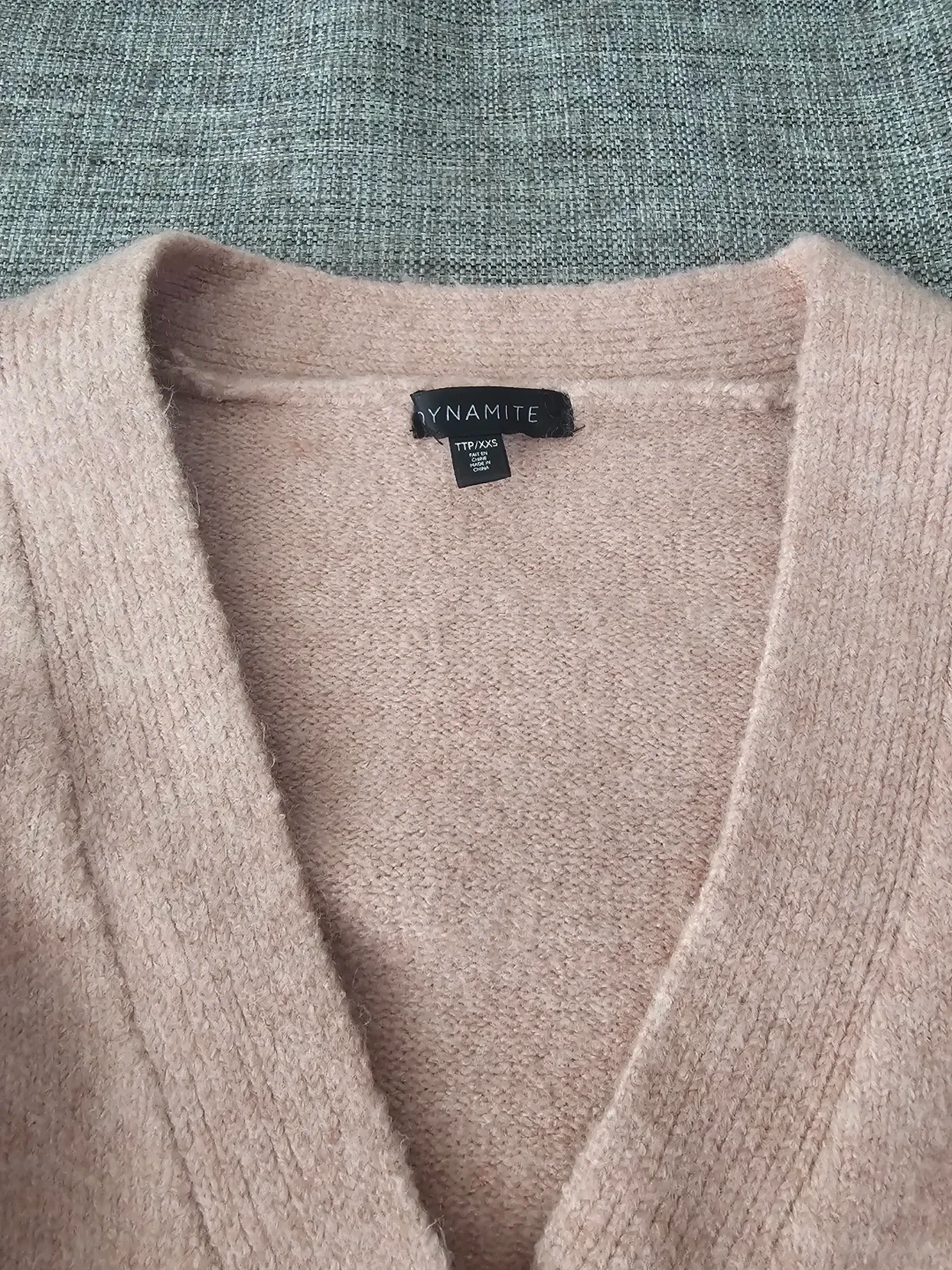 This is a cropped, long-sleeved cardigan from Dynamite. It's a soft pink colour with button closures. Made of a cozy knit material.