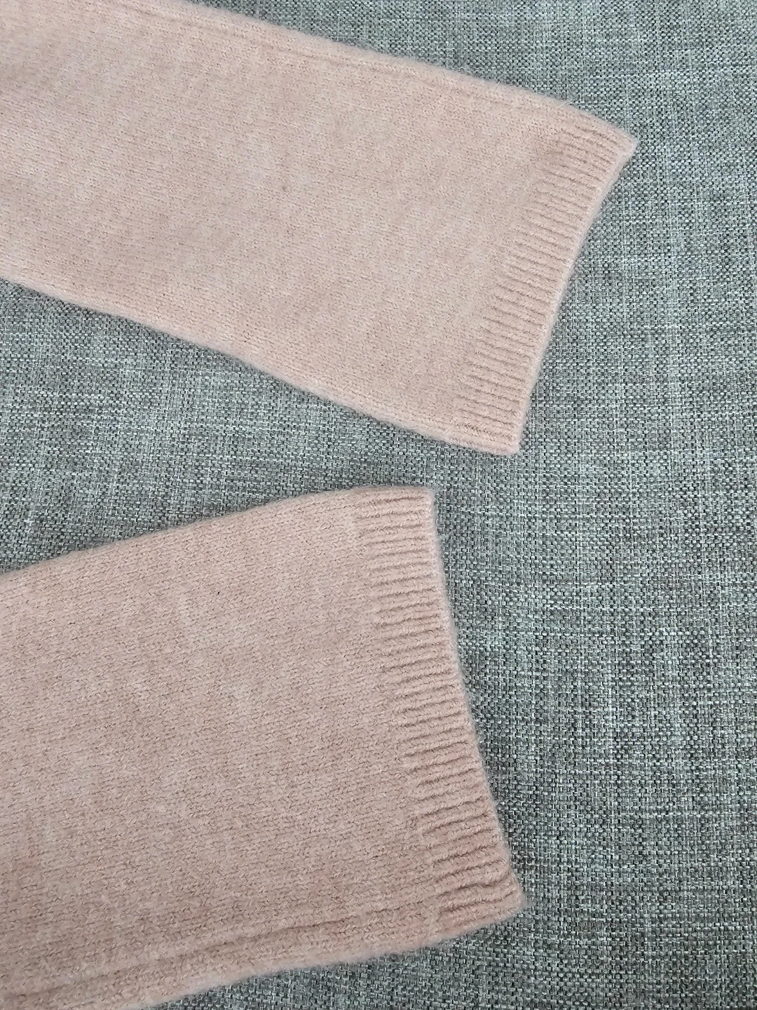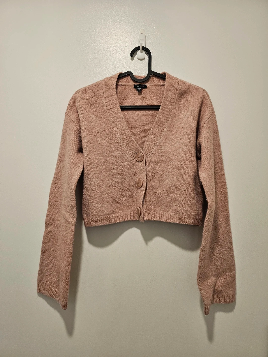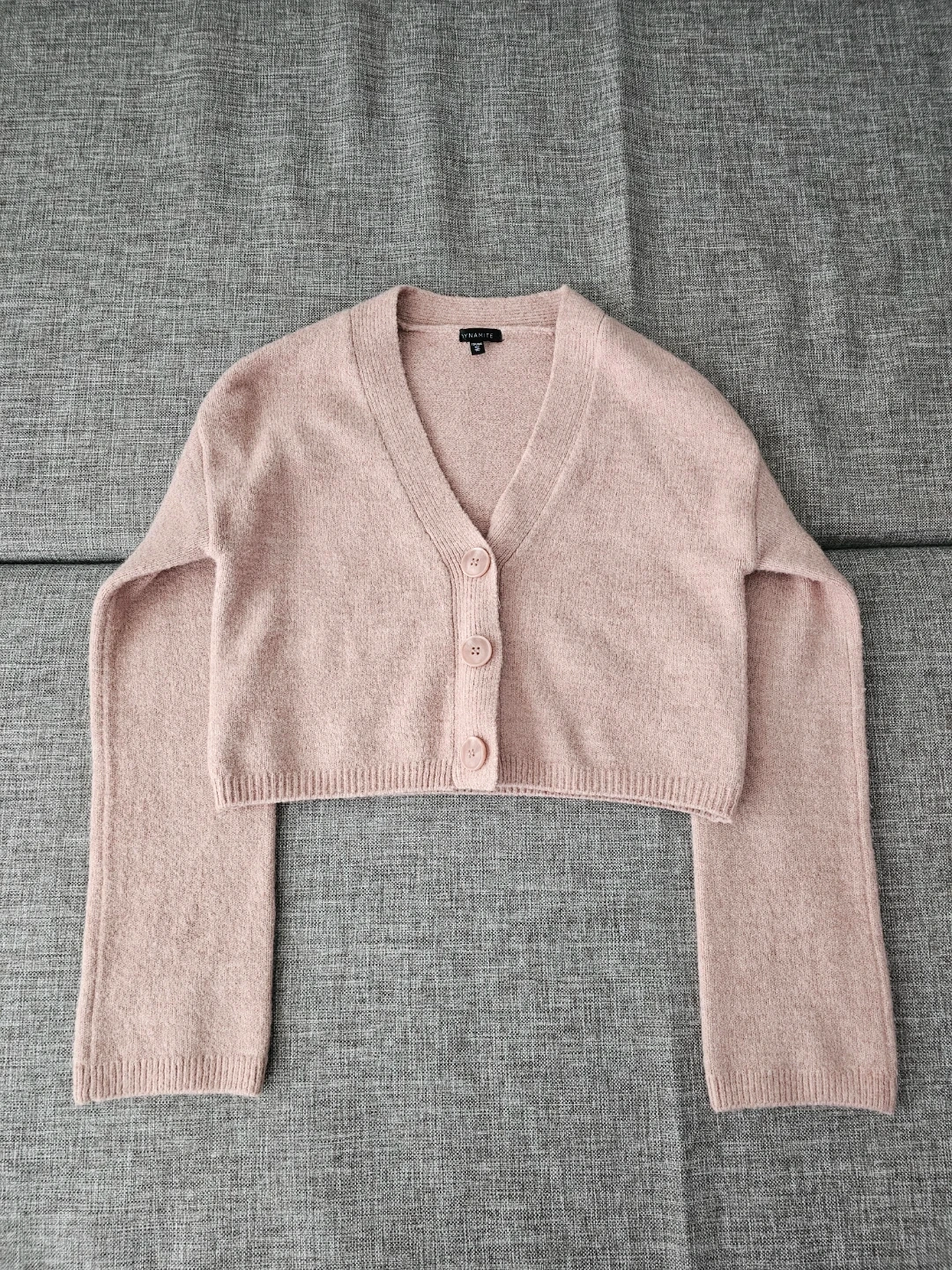 This is a cropped, long-sleeved cardigan from Dynamite. It's a soft pink colour with button closures. Made of a cozy knit material.