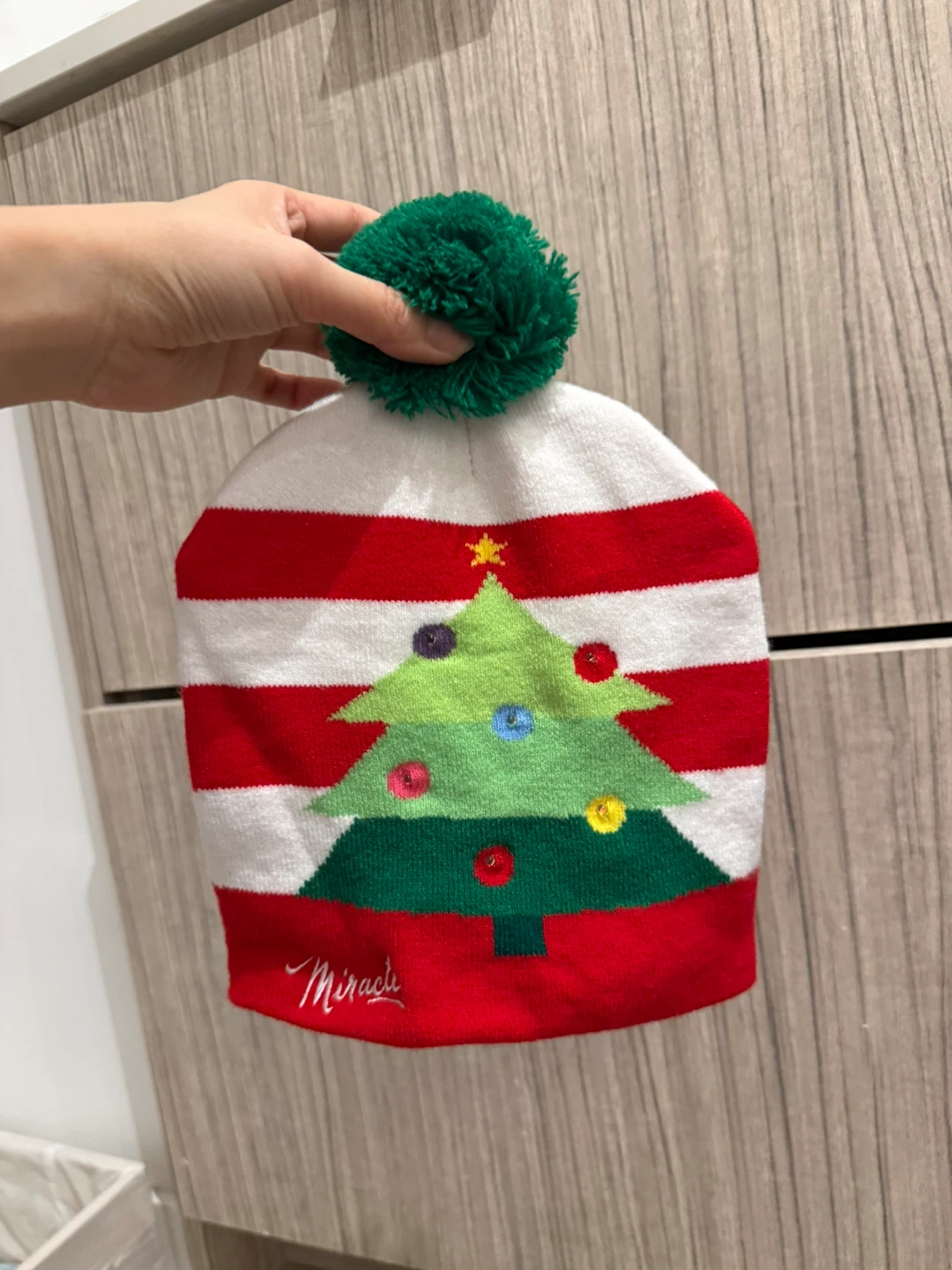Fun holiday beanie featuring a festive Christmas tree design with colorful lights. It's a great way to add some cheer to your winter wardrobe!