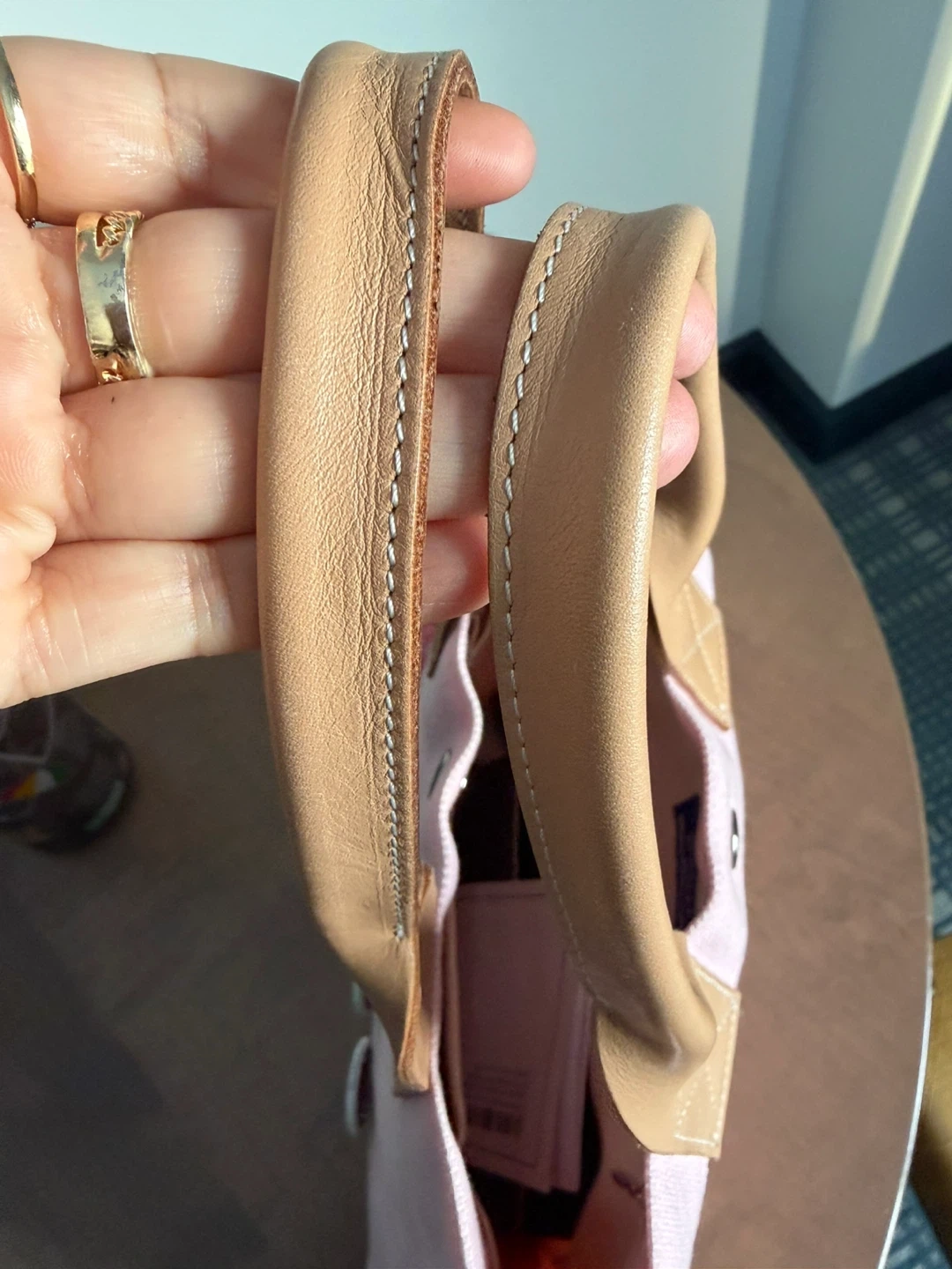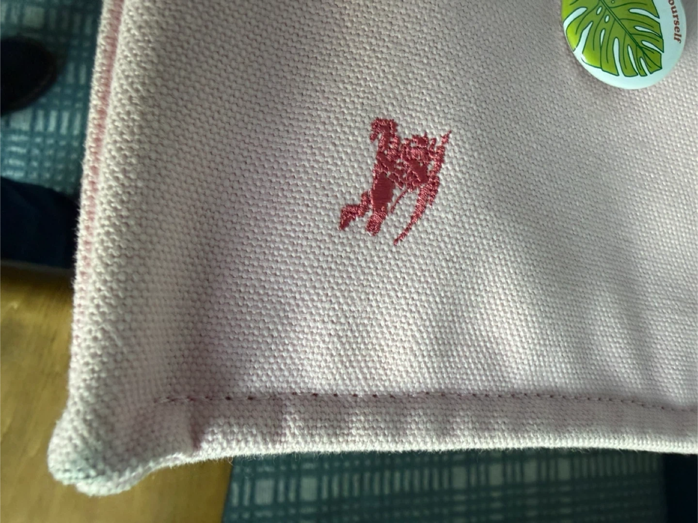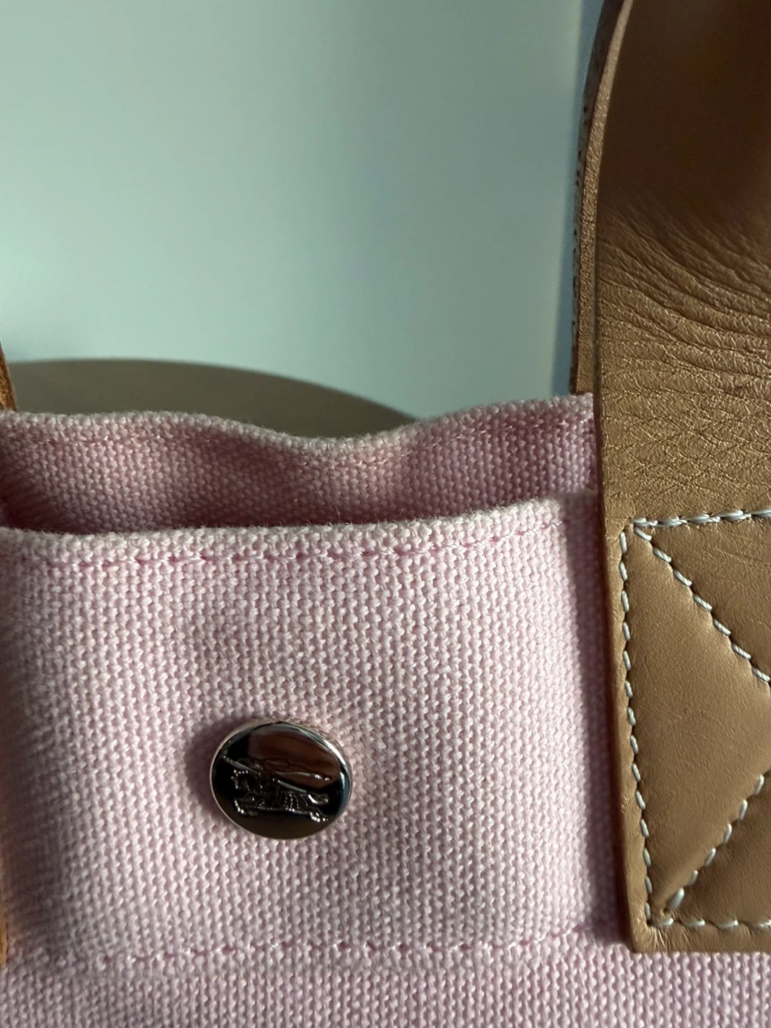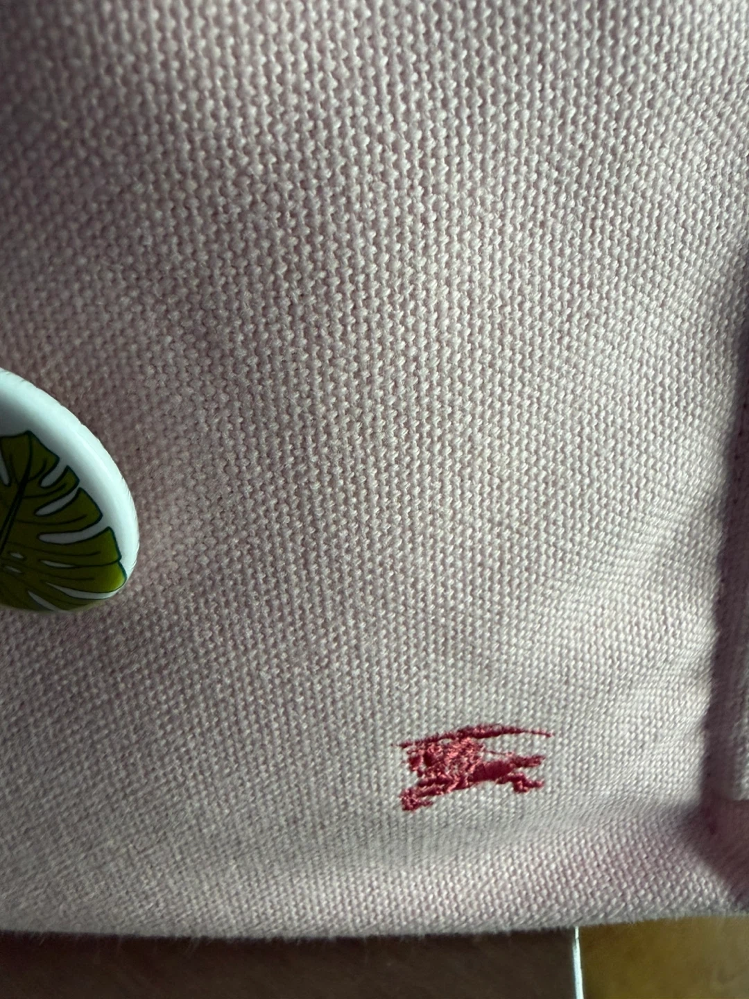 This is a pink canvas tote bag from Burberry. It features leather handles and a snap closure. The iconic Burberry equestrian knight logo is embroidered on the front. Call out small discoloration spot in the front , I cover it with my favorite pins as shown in the pic . You could put some cute patches or use it as is . Very cute color , it will need wash but not as yet .