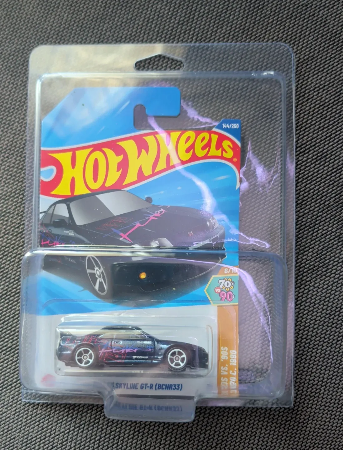 This is a Hot Wheels 144/250 Nissan Skyline GT-R (BCNR33) diecast car. It's in a protective blister pack. Features a blue and pink graphics scheme with Yokohama tires.