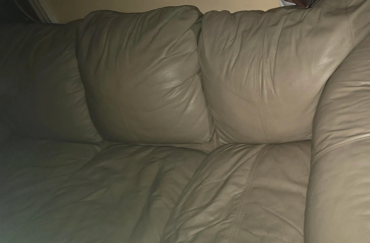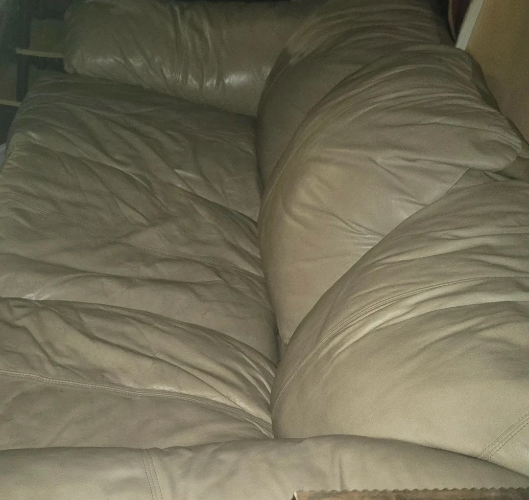 🥕This is a light brown genuine leather sofa bed. It has a classic design with comfortable cushioning. It seats three people with pull out bed, for extra space or guest
