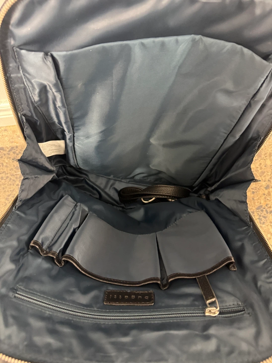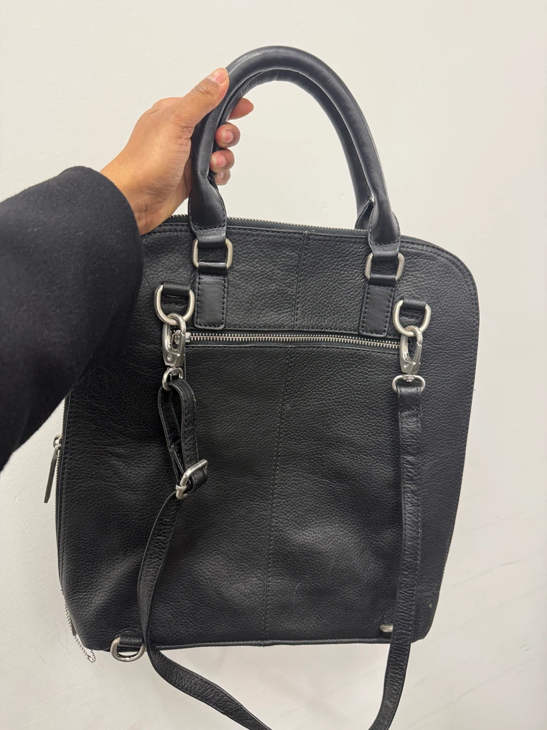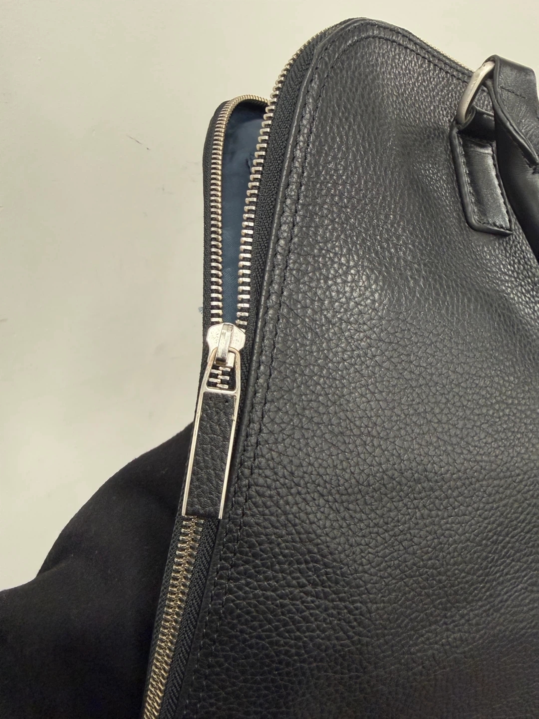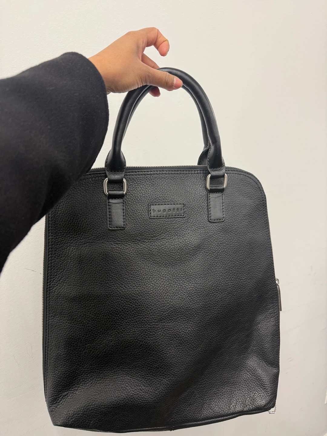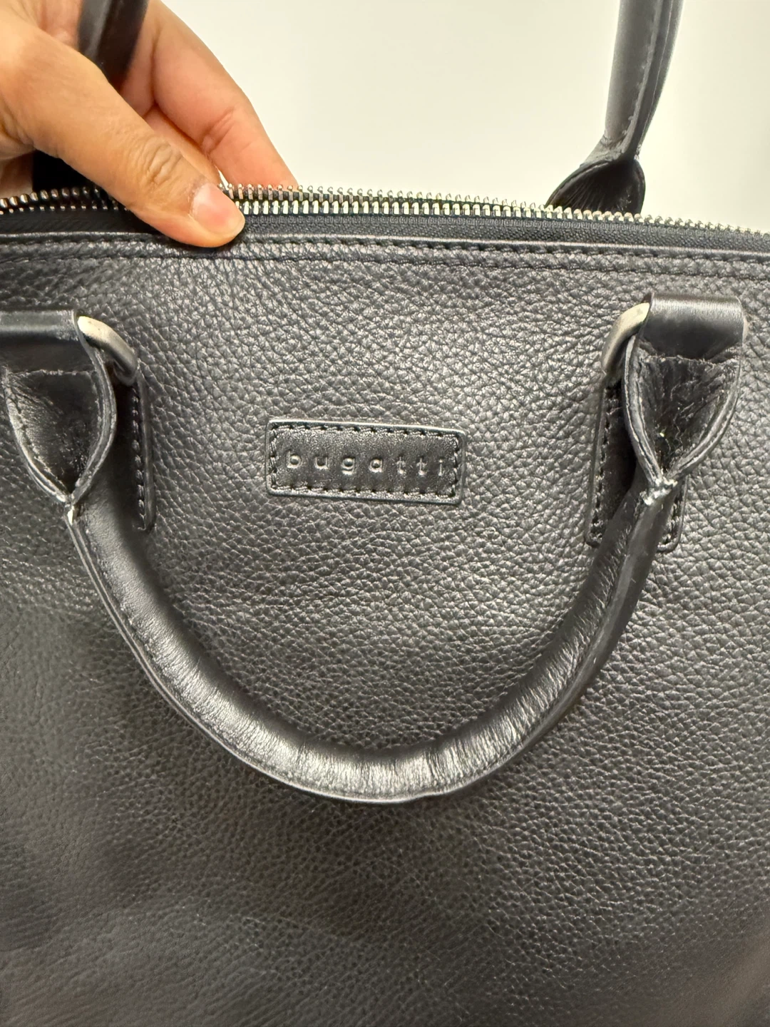 Bugatti black pebble leather handbag. This versatile bag has a zippered main compartment and interior pockets for organization. It's made from genuine leather. Someone needing a stylish and functional bag for daily use or travel would appreciate this.