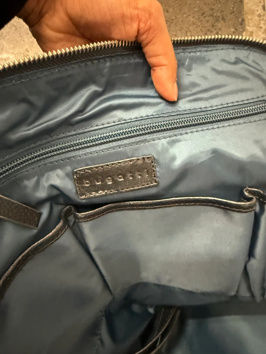 Bugatti black pebble leather handbag. This versatile bag has a zippered main compartment and interior pockets for organization. It's made from genuine leather. Someone needing a stylish and functional bag for daily use or travel would appreciate this.