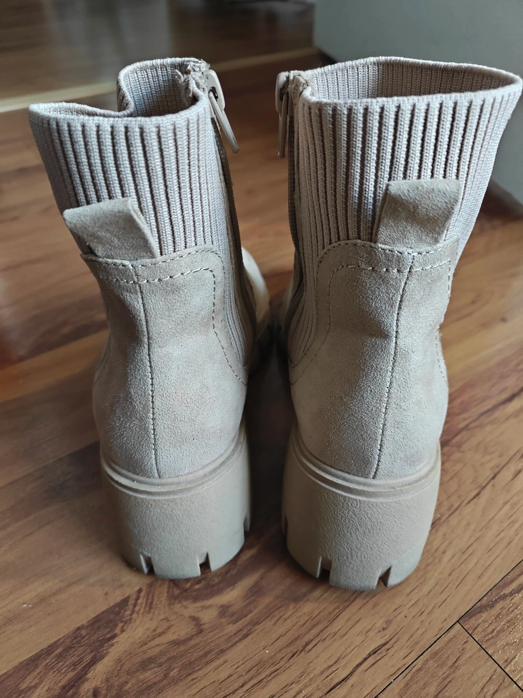 Selling a pair of beige ankle boots. They feature a chunky sole and a sock-like upper. They are in great condition and ready for a new owner!