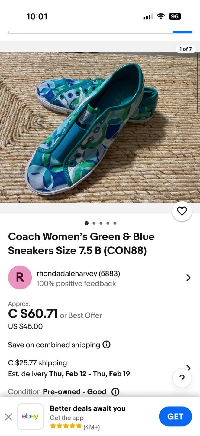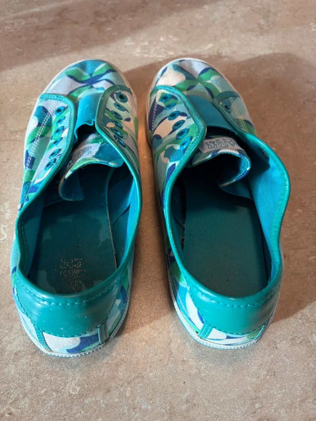 These are pre-owned Coach slip-on sneakers in a women's size 8.5. They feature a colourful green and blue geometric pattern. The canvas upper and textile lining make them comfy for everyday wear.