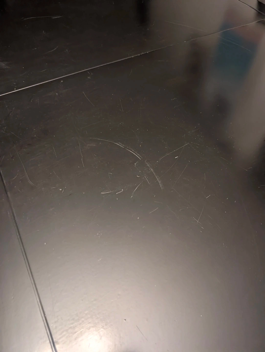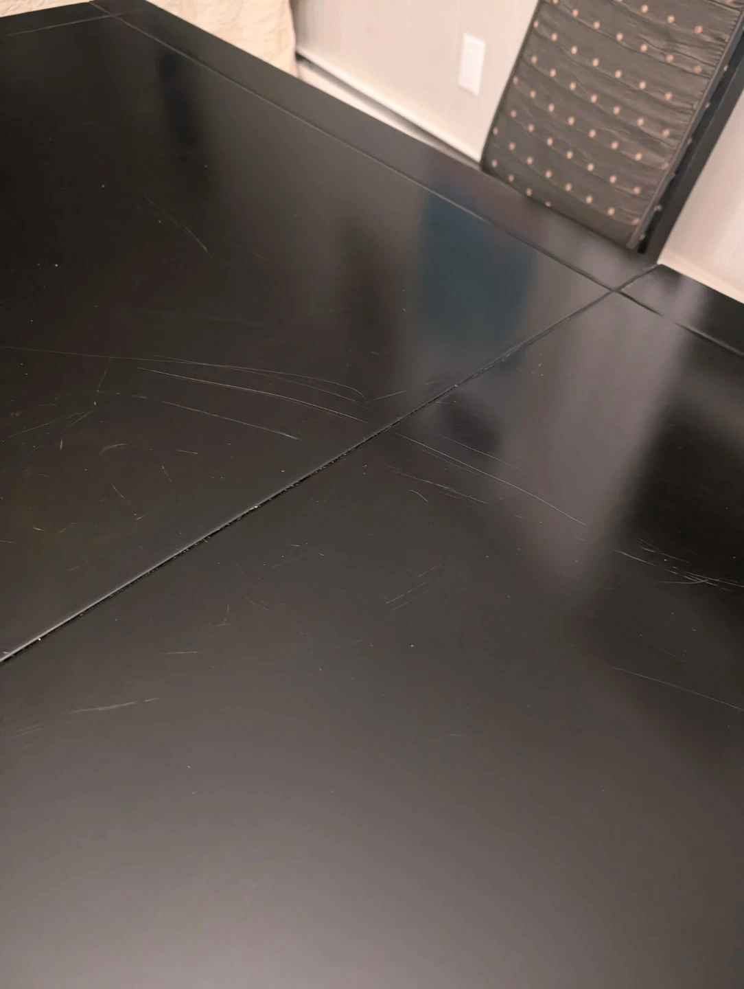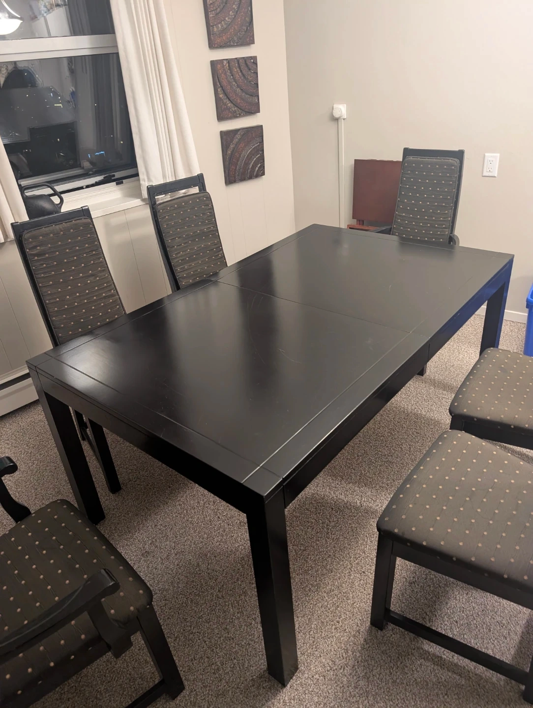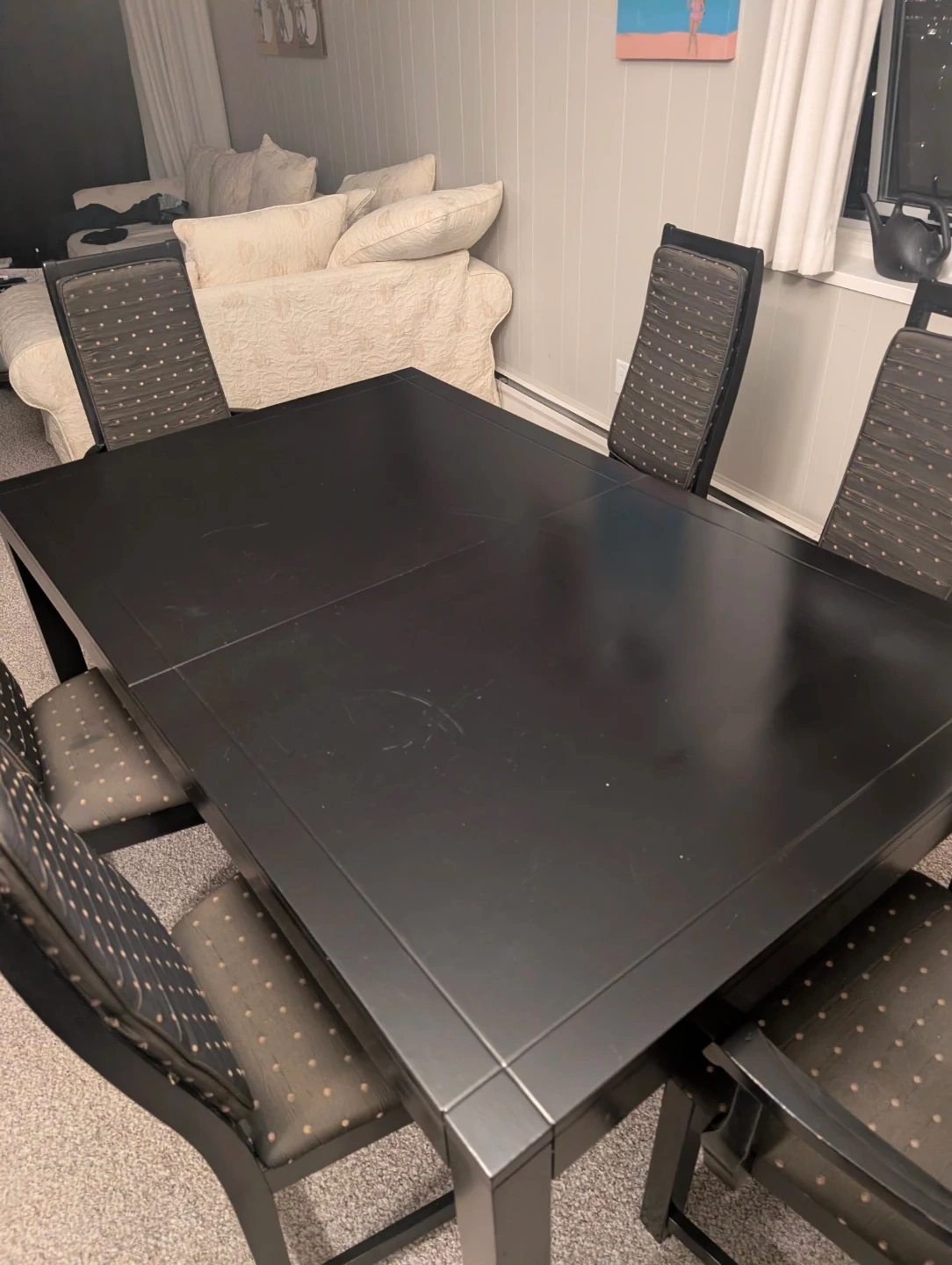 This is a black dining table set that includes the table and four chairs. The table surface has some visible scratches. It's a great set for family meals or entertaining guests.