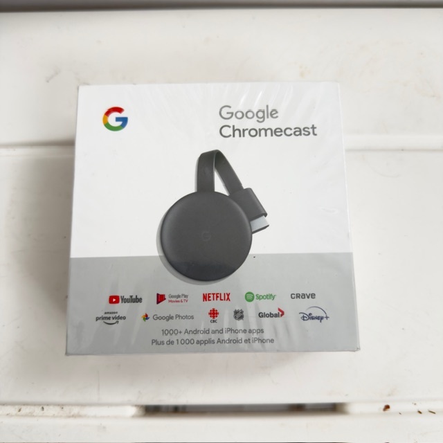 Selling a brand new Google Chromecast! It's still in its original packaging and ready to stream all your favorite shows from YouTube, Netflix, Spotify, and more. It also supports Google Photos, CBC, Global, and Disney+!