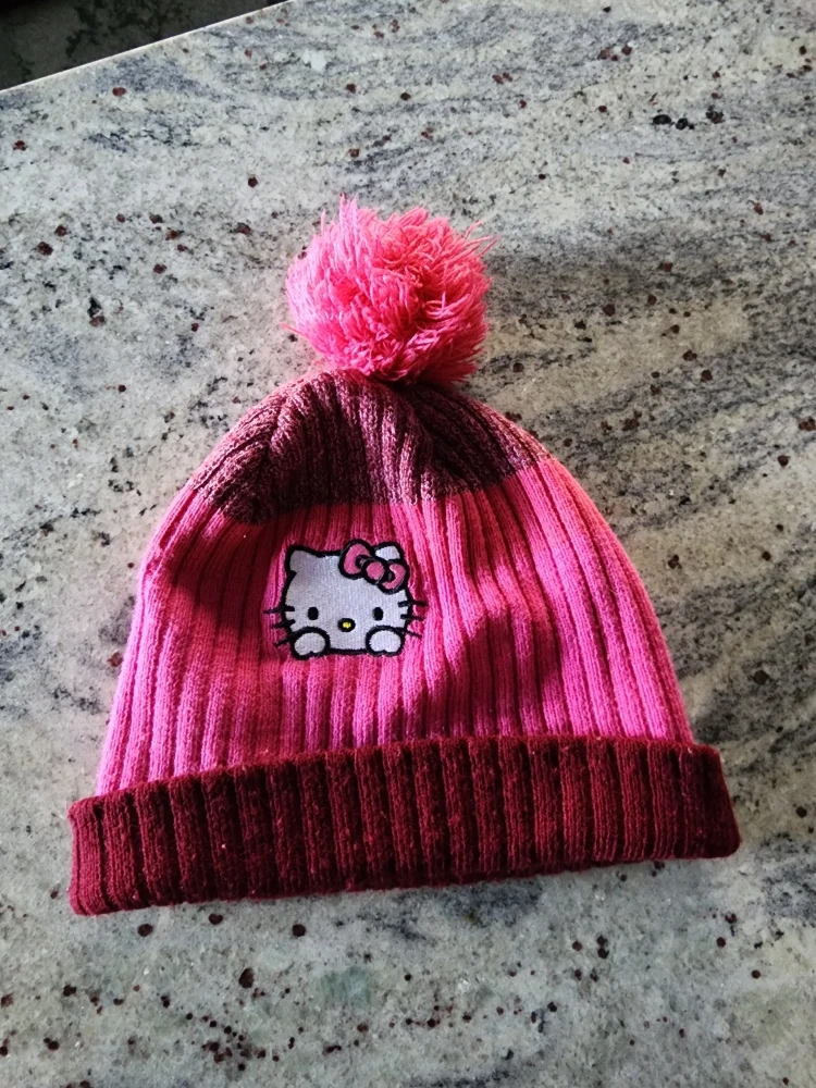 Check out this adorable Hello Kitty beanie! It features a cute pom pom on top and the iconic Hello Kitty logo. The beanie is a mix of pink and burgundy colours, perfect for adding a touch of fun to any outfit
