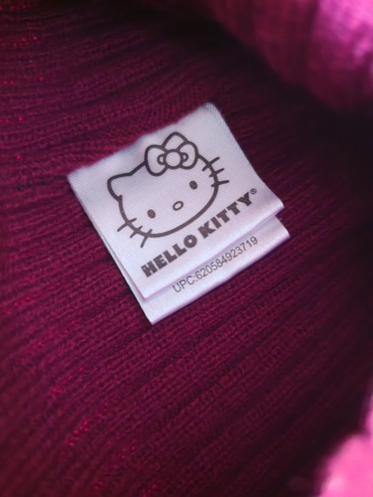 Check out this adorable Hello Kitty beanie! It features a cute pom pom on top and the iconic Hello Kitty logo. The beanie is a mix of pink and burgundy colours, perfect for adding a touch of fun to any outfit