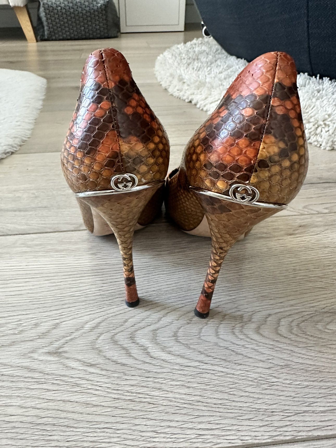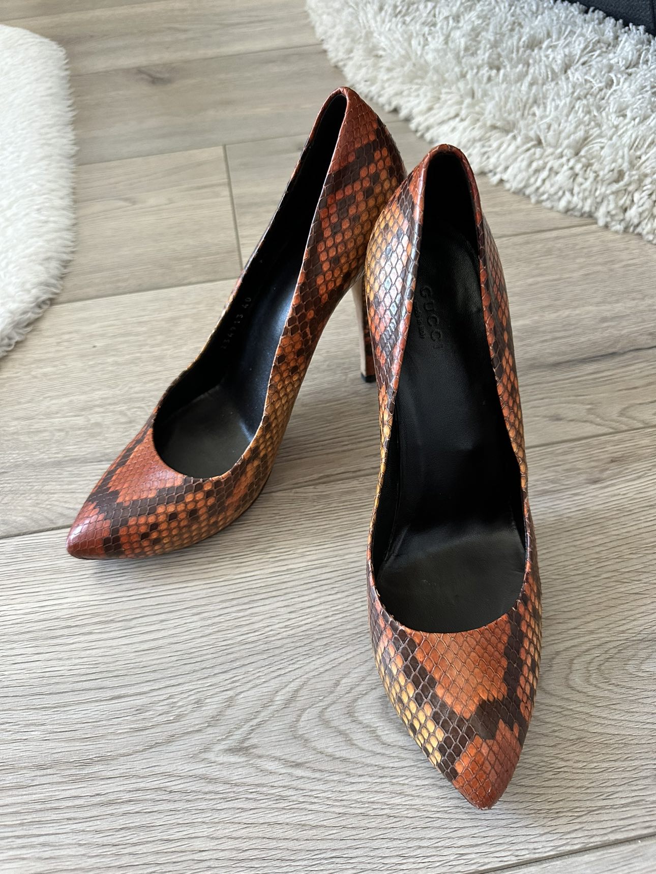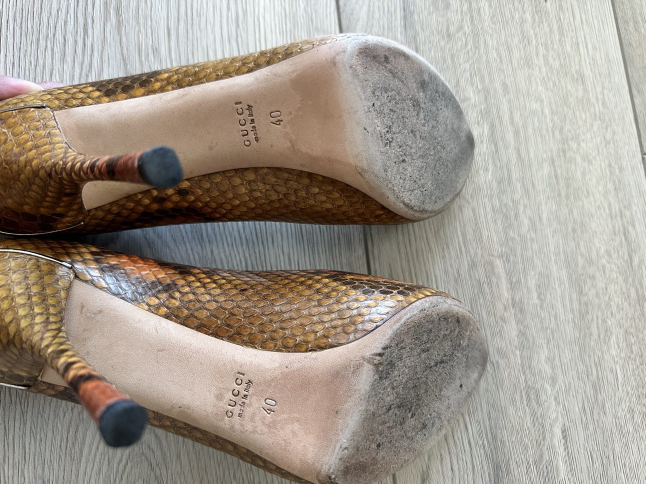 584Authentic Gucci 4-inch heels - Size EU 40 but can fit more like size EU 39.5 or US 9 comfortably. Phyton genuine leather insole and outsole. Clean inside. Pristine condition. Decluttering my closet as I don't wear heels anymore. Made in Italy.