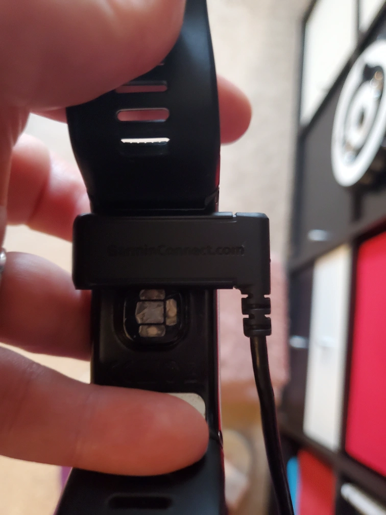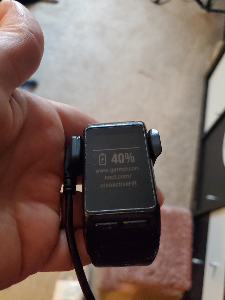 Garmin viviactive with charging cable. Some damage to heart rate monitor, but still works perfectly. Would avoid taking it in shower or under water, but fine in rain.