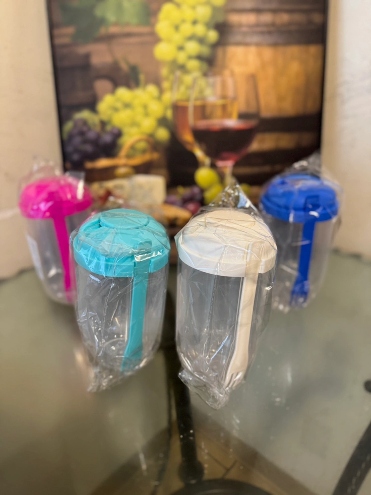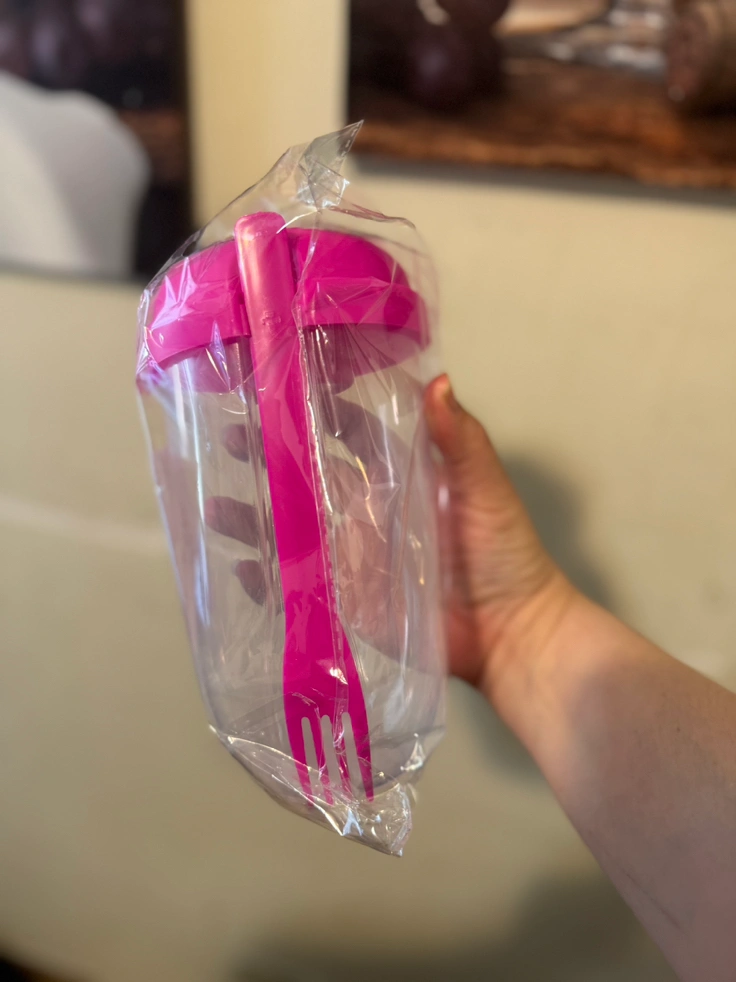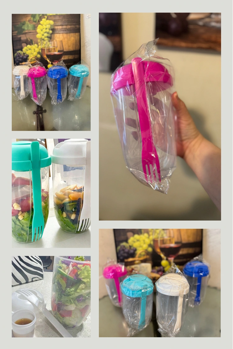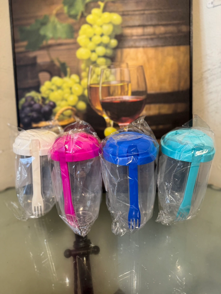Stay fresh on-the-go with a Salad Cup featuring lids and a fork. This convenient shaker container is perfect for maintaining a healthy lifestyle, allowing you to mix and enjoy your favorite salads anywhere. Ideal for portable breakfasts, meals, and snacks packed with vegetables and fruits." All different colors.
