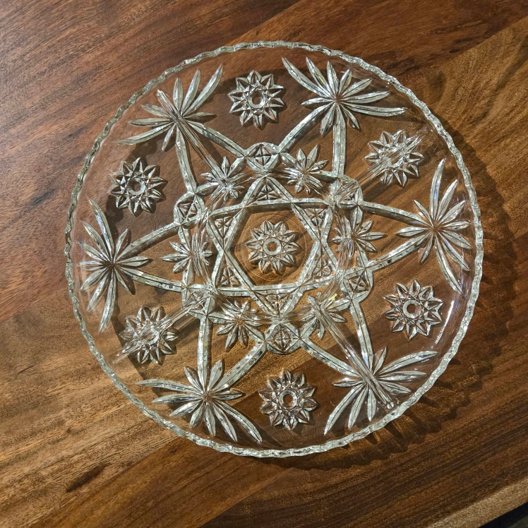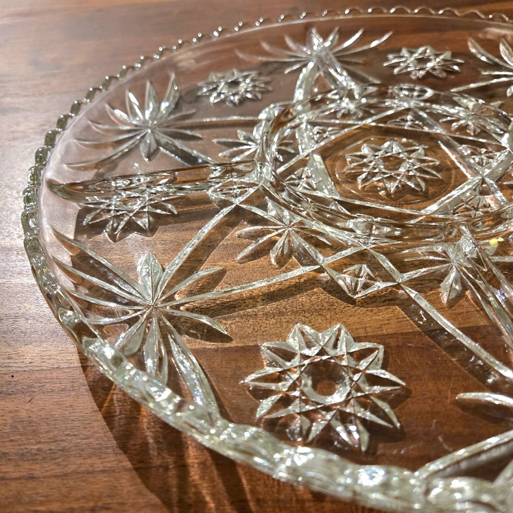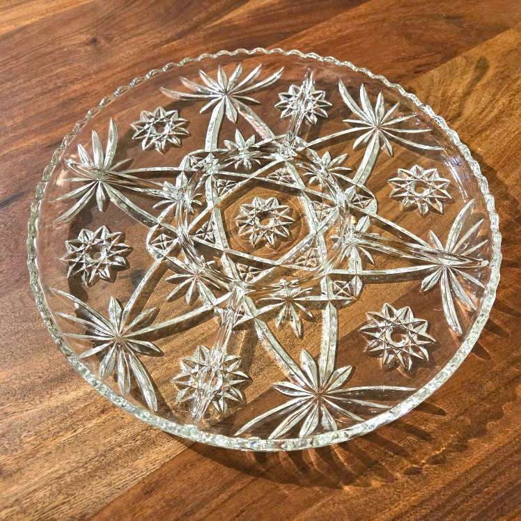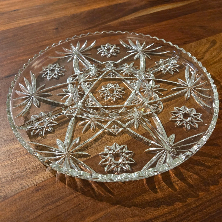 Beautiful vintage crystal serving platter. Features a starburst design and divided sections. Perfect for parties or entertaining. Clear glass, scalloped edge.
