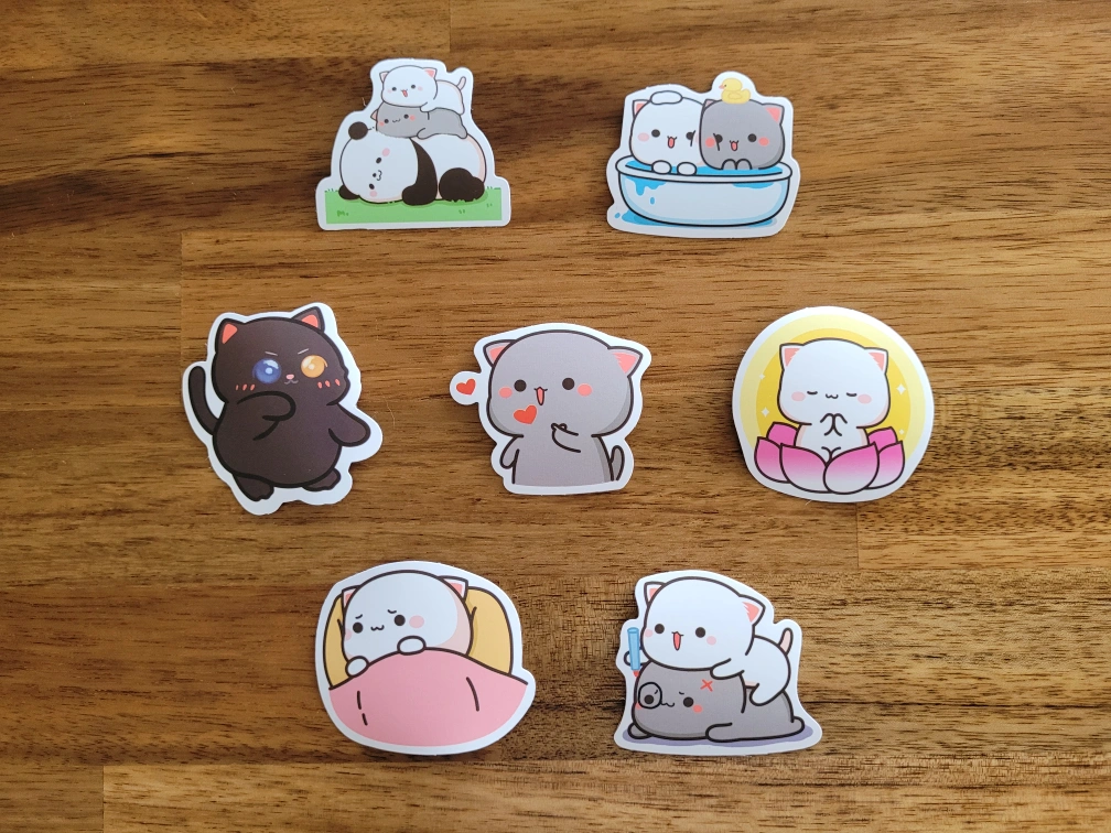 Seven cute cat stickers. Each one is roughly 2 inches wide.