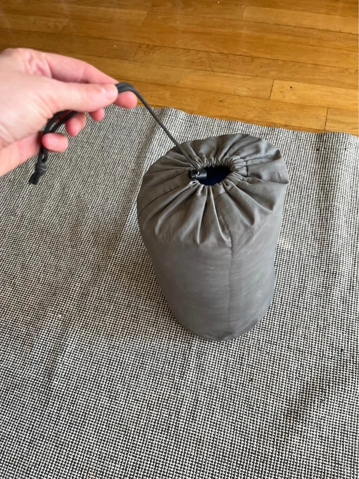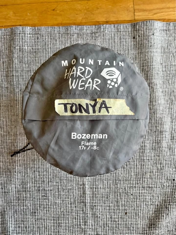 Warm Mountain Hardwear Bozeman Flame sleeping bag. Rated 17F / -8C. Comes in its stuff sack. Good for camping trips. Tried and true mummy bag.