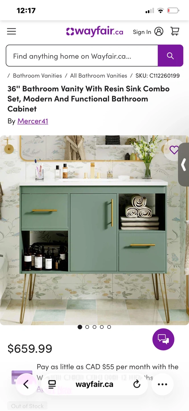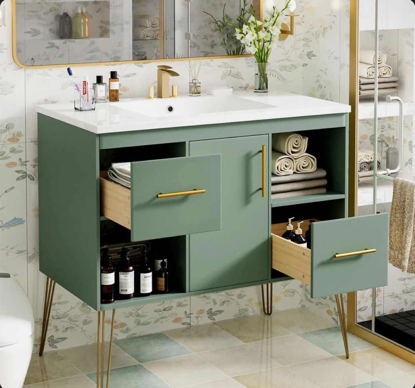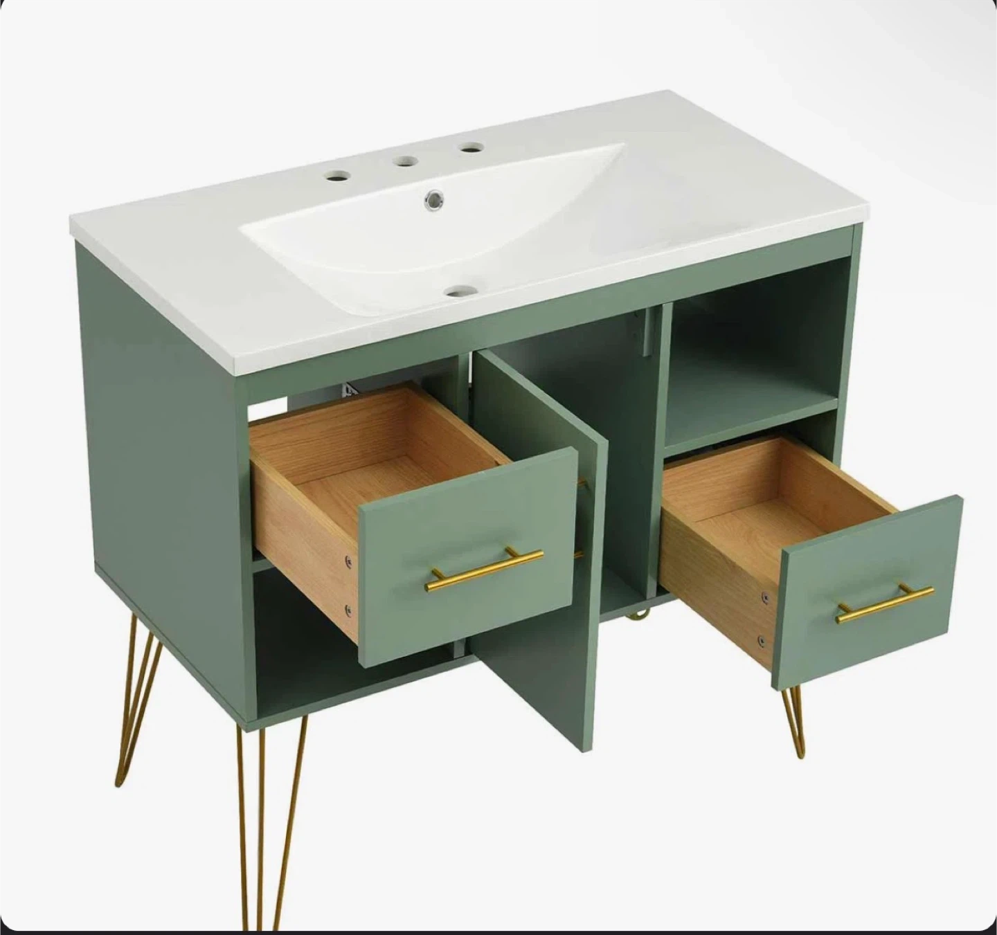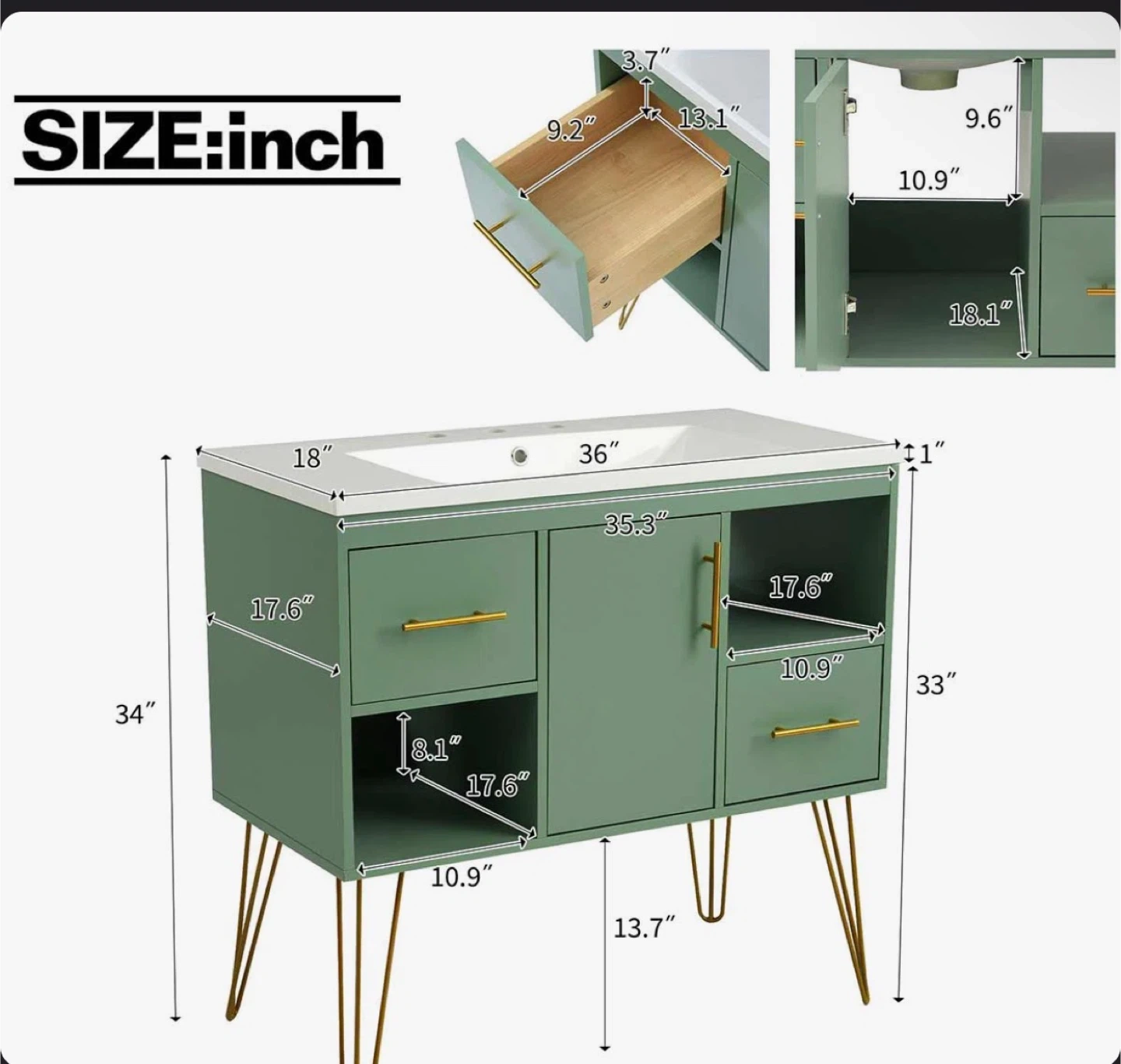 This 36-inch bathroom vanity features a resin sink combo. It includes two drawers and a cabinet with shelving for ample storage. The unit is made of durable materials and stands on stylish gold hairpin legs. Its modern design fits well in most bathrooms.