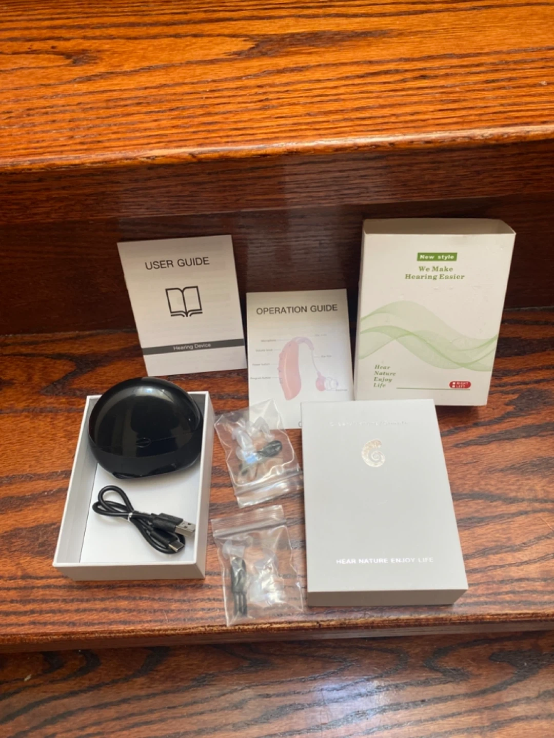 This set includes a pair of rechargeable hearing aids with a charging case. It comes with a USB charging cable and multiple sizes of ear tips for a comfortable fit. Also included are cleaning tools and user guides. Make hearing easier with this convenient set!