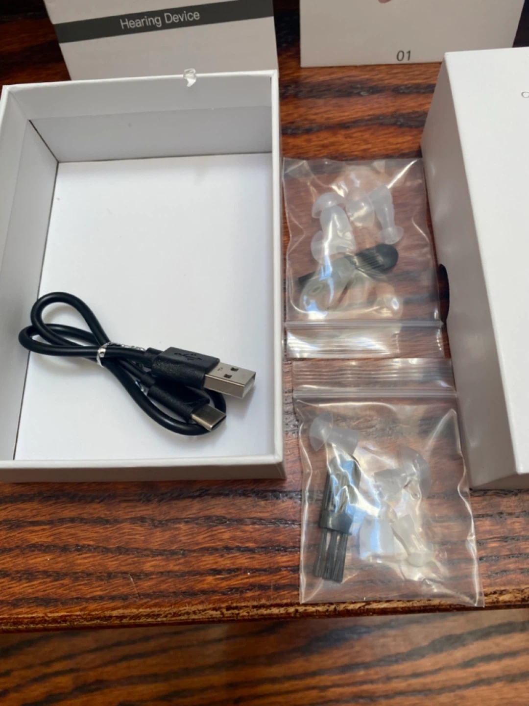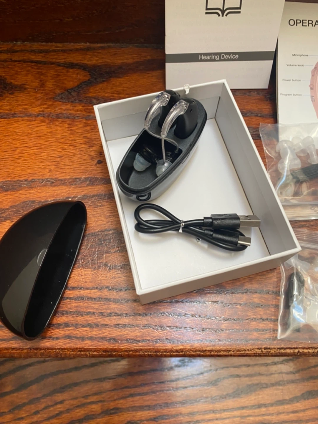 This set includes a pair of rechargeable hearing aids with a charging case. It comes with a USB charging cable and multiple sizes of ear tips for a comfortable fit. Also included are cleaning tools and user guides. Make hearing easier with this convenient set!
