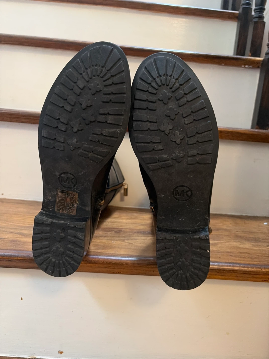 Michael Kors black leather riding boots. Features a rubber outsole and gold-tone hardware. Leather upper. Size 9.