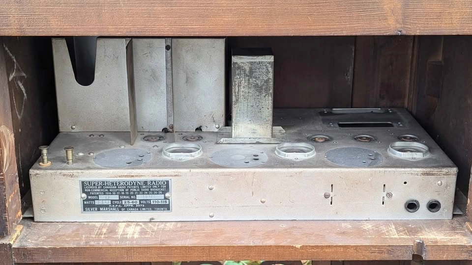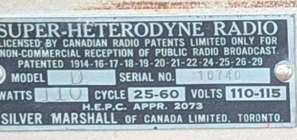 170Rare early 1930s Silver-Marshall Model D Super-Heterodyne floor-standing radio, made in Toronto by Silver-Marshall of Canada Limited. Beautiful period walnut cabinet with original hardware and embossed metal ID tag (Serial No. 10740). Type: Super-Heterodyne Model: D Serial: 10740 Power: 110 Watts / 110–115 Volts / 25 –60 Cycles Made in Toronto, Ontario Untested / sold as-is (has not been plugged in) Perfect as a restoration project, display piece, or prop for film/theatre