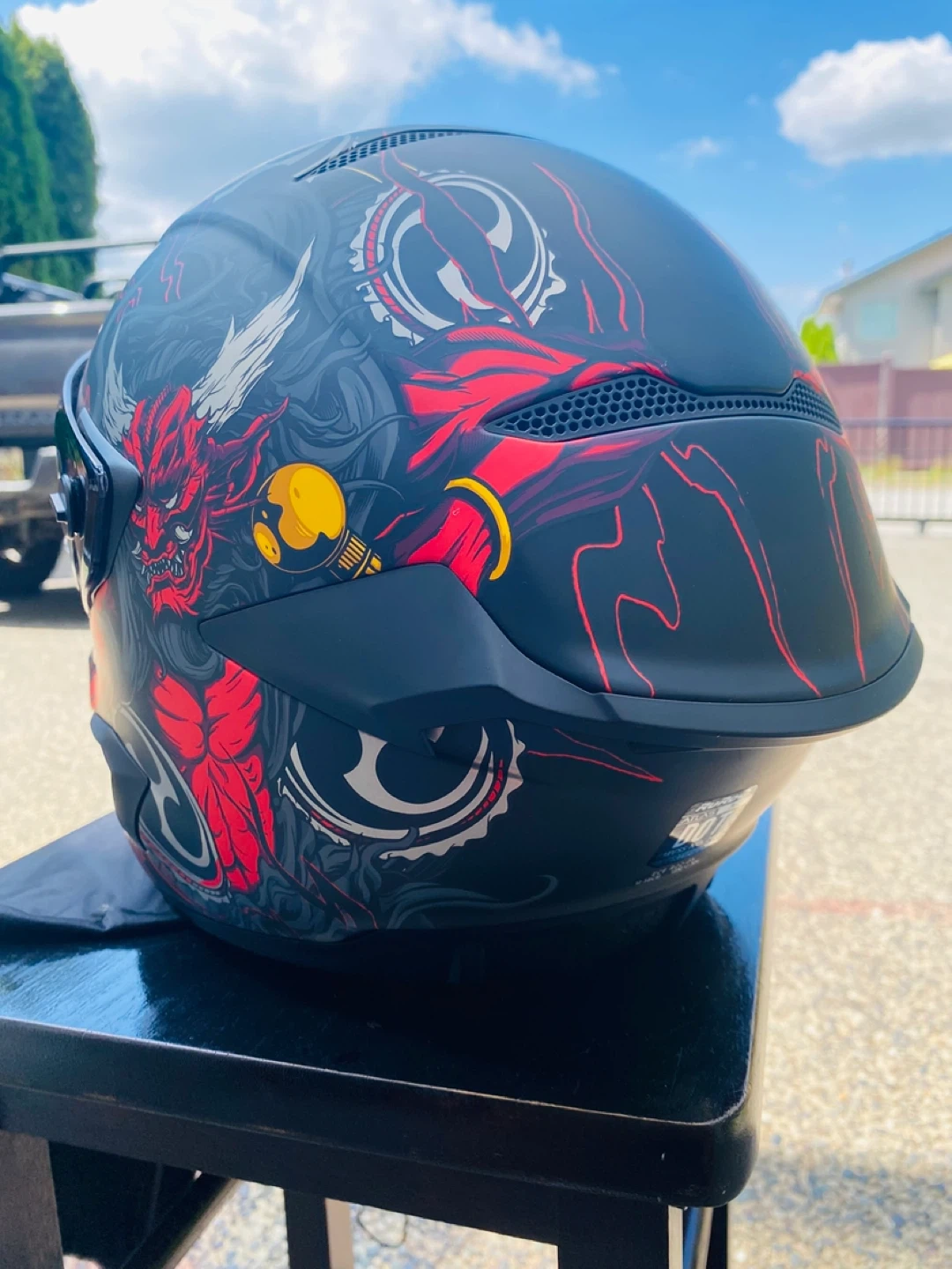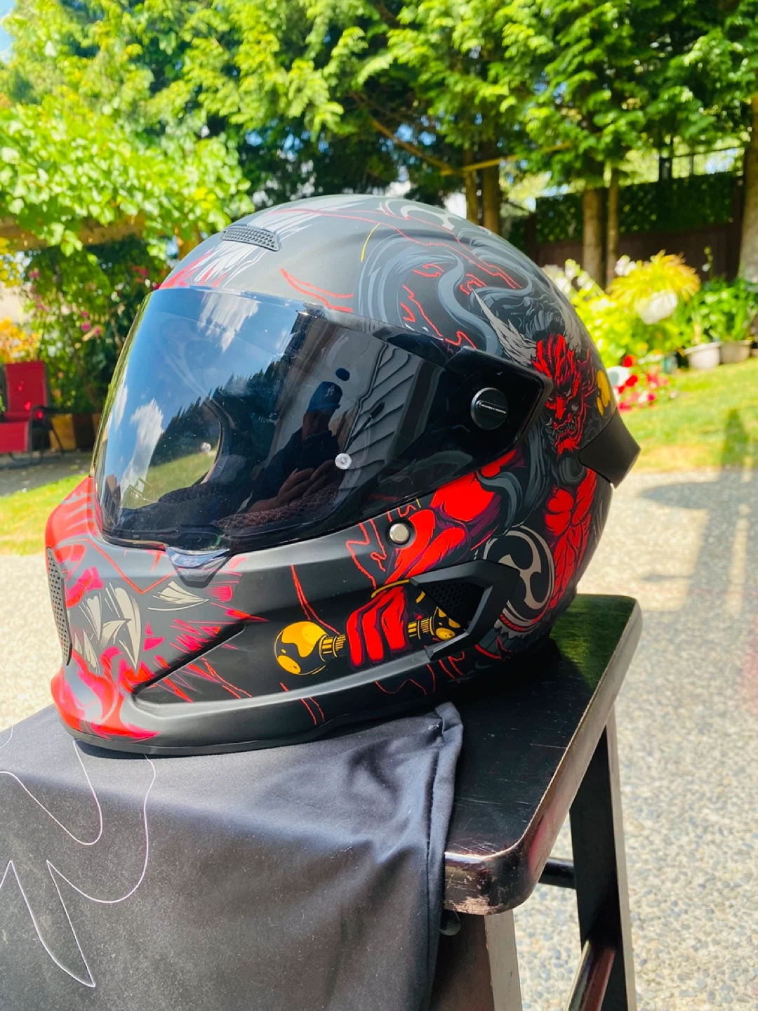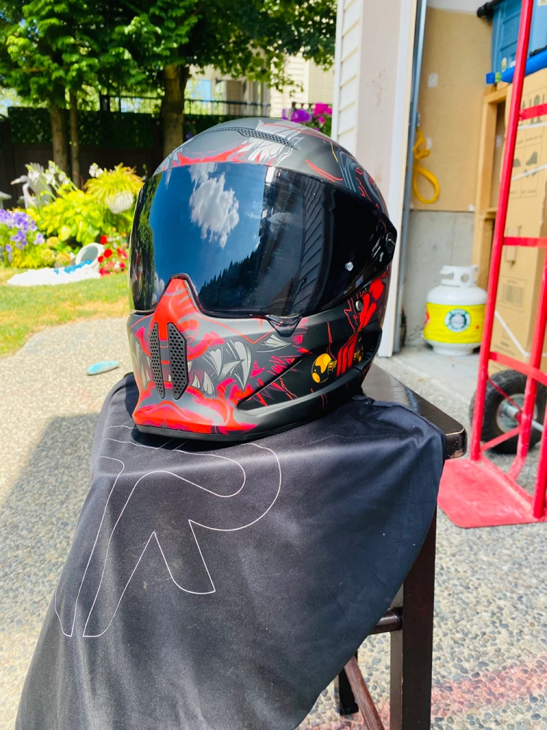 Full-face motorcycle helmet with a striking red and black graphic design. It features a tinted visor and ventilation ports. Helmet is in good condition.
