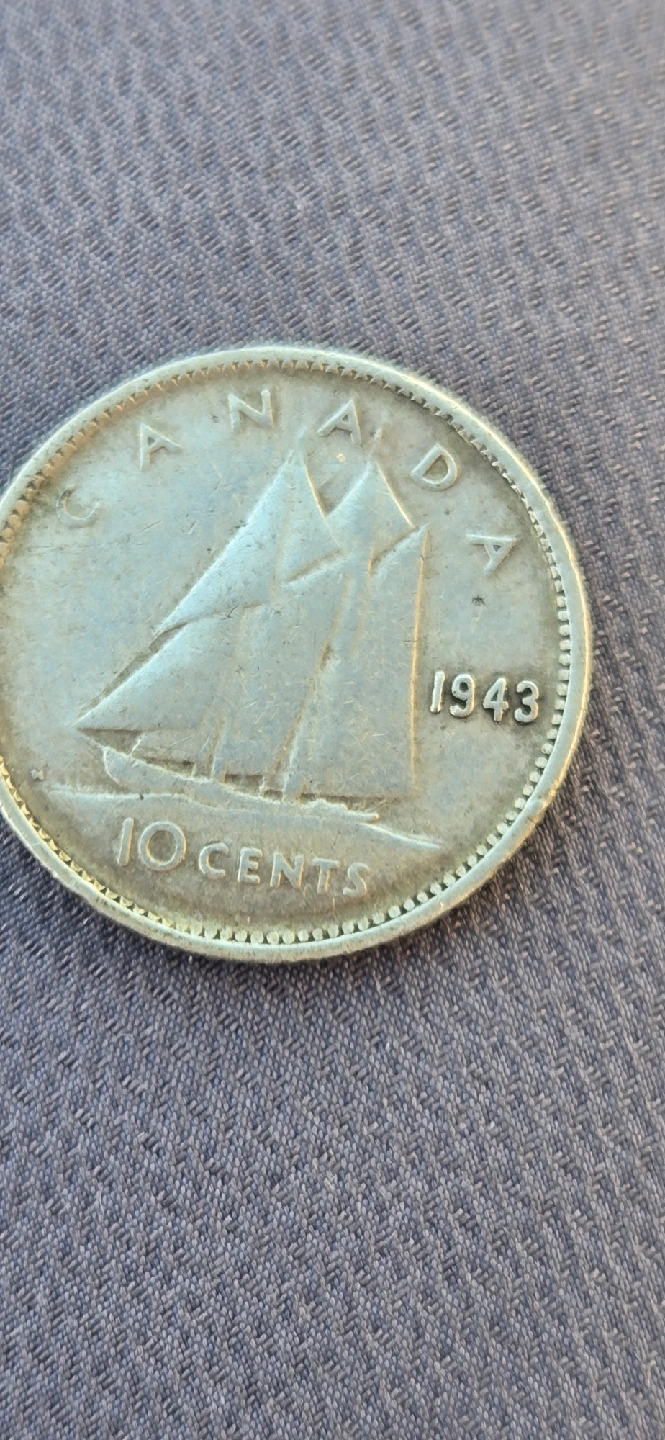 Selling a 1943 Canadian ten cent coin. It features a sailing ship design. A great piece for any collector!