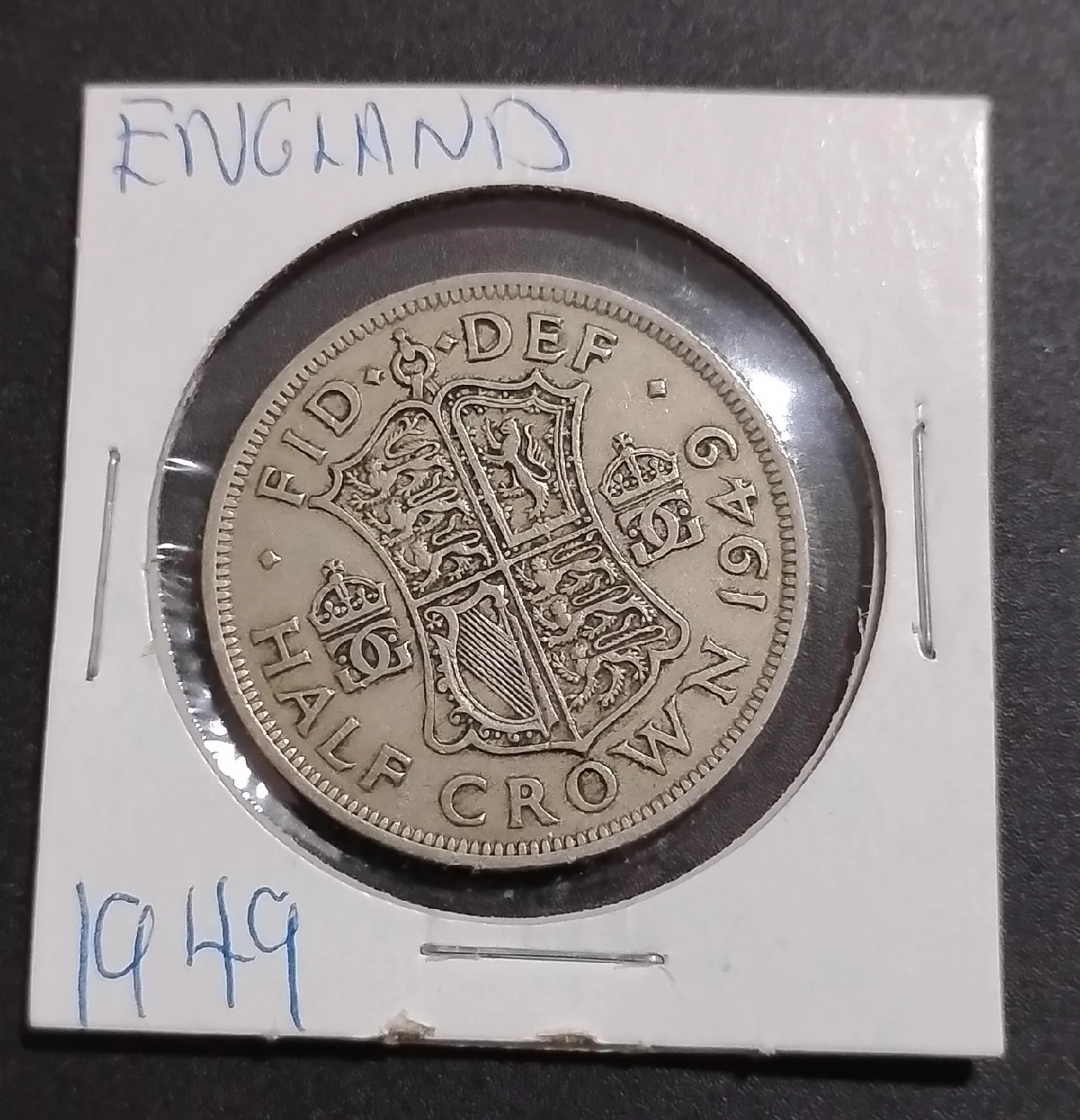 290Selling a 1949 England Half Crown coin. It features a detailed design and is in good condition for its age. A great piece for collectors!