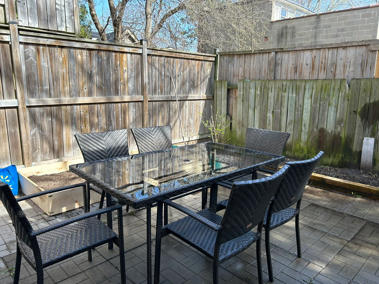 A Patio set table with glass top with 6 chairs