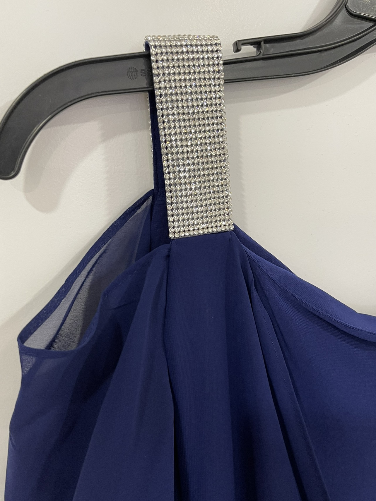 Extremely lightweight and comfortable. Has a hidden back zipper, with peekaboo shoulders, and semi sleeves/cape like with glitzy rhinestones shoulder straps, along with a glitzy gathering to the side.