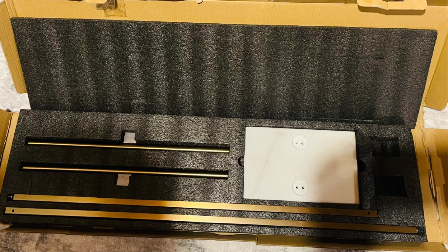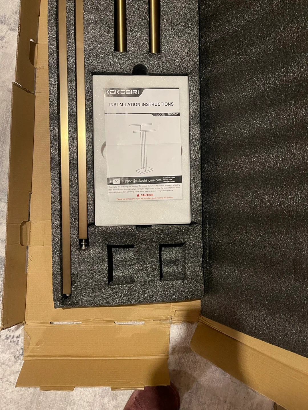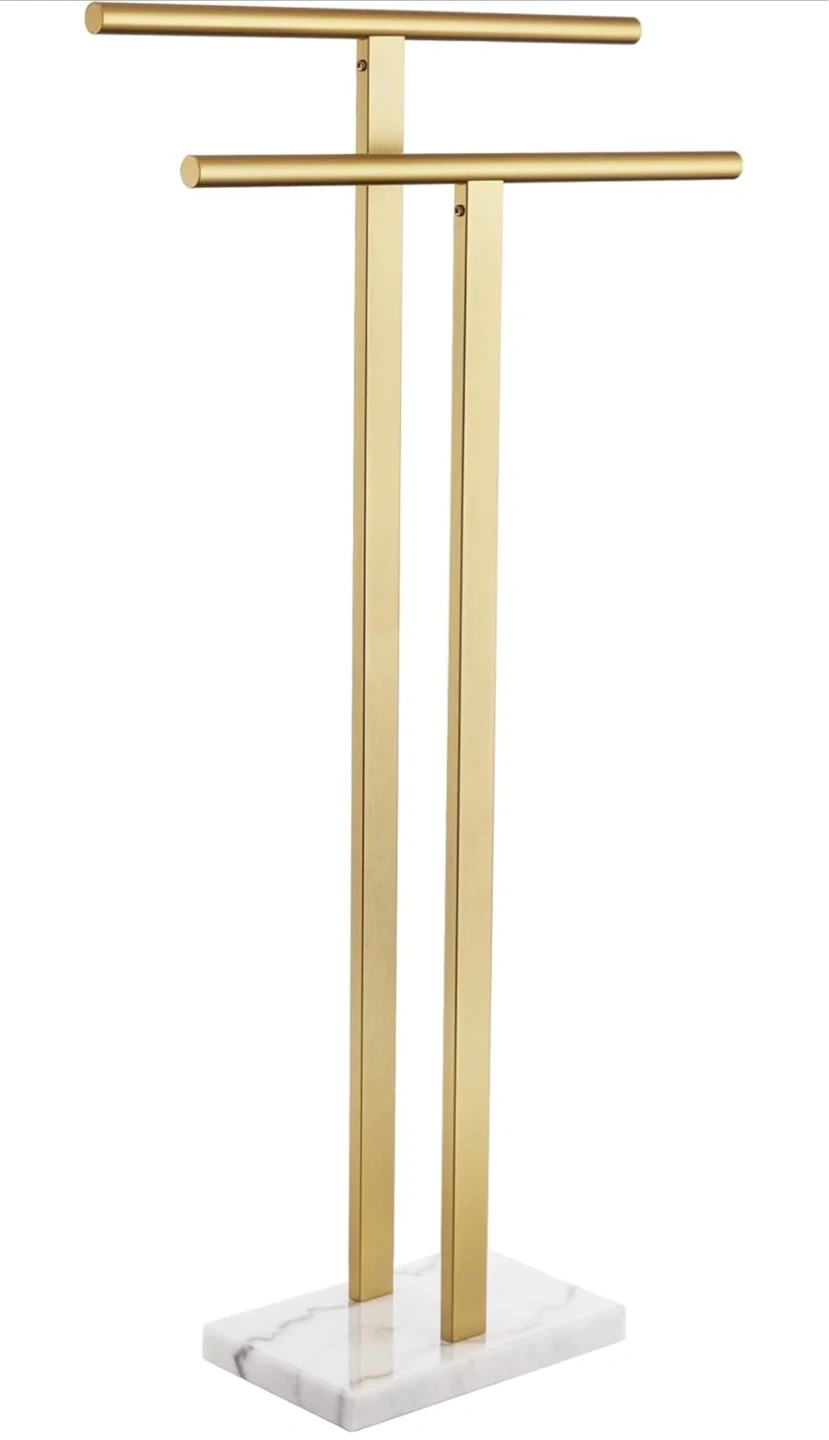 This freestanding towel rack features a "T-shaped" design with two bars for hanging towels. It has a stable base with a 9 lbs weight. The gold finish and marble-look base add a stylish touch to any bathroom. It's designed to be stable and won't tip over!